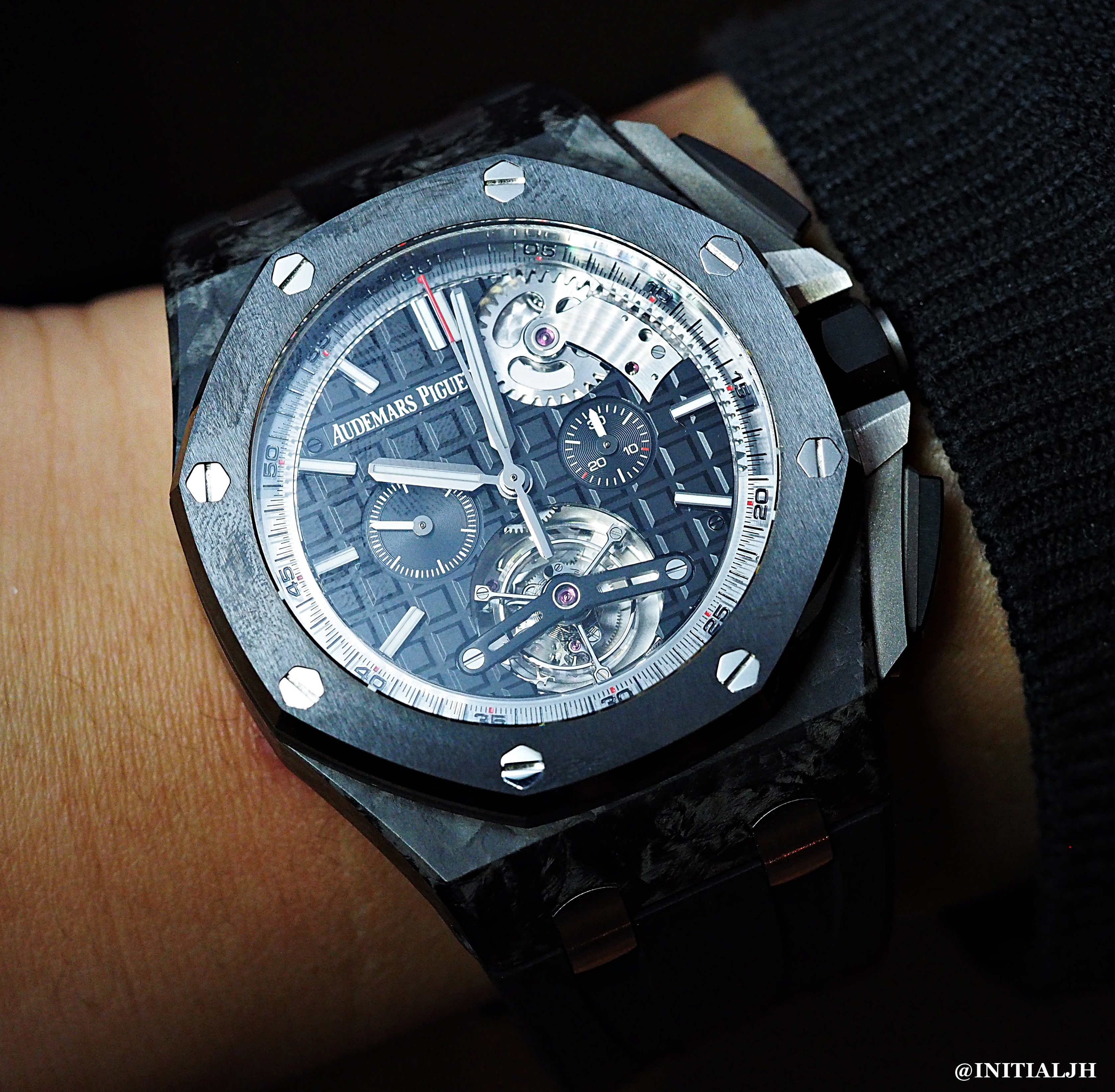 The 44mm sized watch case (14mm thick) is forged carbon, as per its ROO Tourbillon Chronograph predecessor, and a material that has been used to great effect and popularity by Audemars Piguet over the years. The bezel/ crown/ chronograph pushers are black ceramic and the pusher guards, titanium.