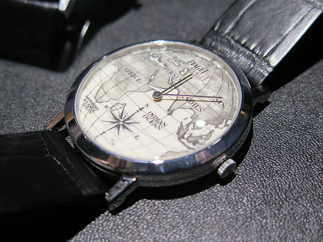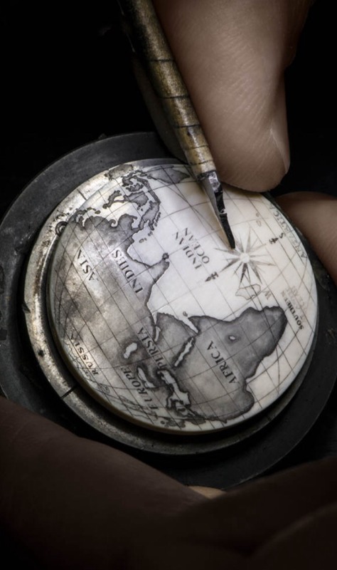The man Piaget engaged to decorate this Scrimshaw piece (and who has in fact done other pieces for Piaget previously) is Richard Maier, the choice of a section of the globe perhaps a nod to scrimshaw’s origins. The line/ dot engraving itself is done with needles and small engravers sharpened with diamond files to aid precision. After the engraving there is the application of ink to ‘fill’ it.
