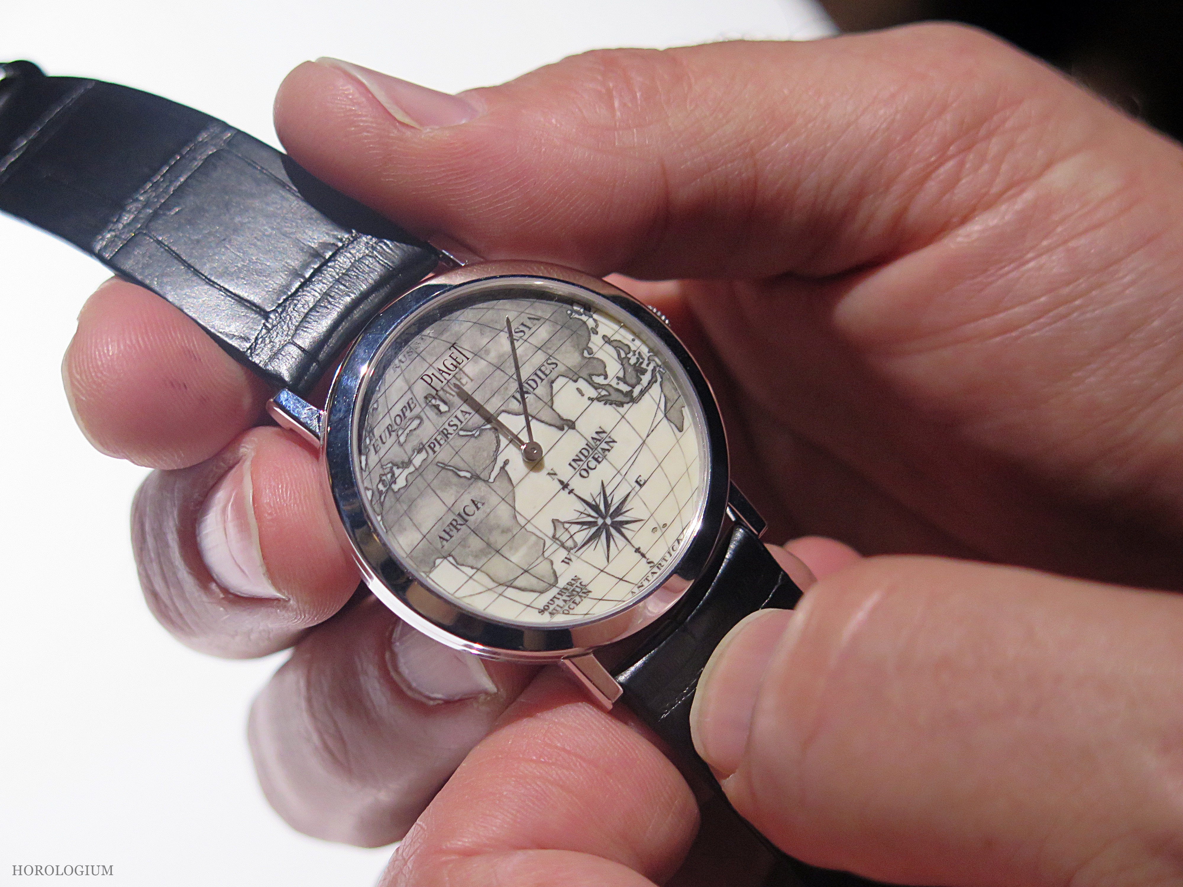 The man Piaget engaged to decorate this Scrimshaw piece (and who has in fact done other pieces for Piaget previously) is Richard Maier, the choice of a section of the globe perhaps a nod to scrimshaw’s origins. The line/ dot engraving itself is done with needles and small engravers sharpened with diamond files to aid precision. After the engraving there is the application of ink to ‘fill’ it.