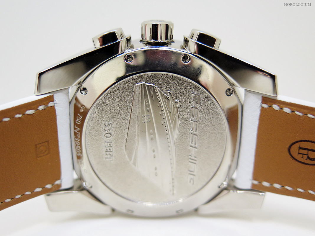 You will notice a small starfish at 3 o’clock. This is actually a seconds indicator, spinning its whimsical way in a circular fashion as the seconds pass. To continue the underwater theme, there is an octopus on the centre elapsed seconds hand. The dial itself is blue mother-of-pearl with snailed counters and luminous delta-shaped hands. The caseback shows an engraving of a Pershing boat as well as a number engraving. It comes on a white Hermès strap.