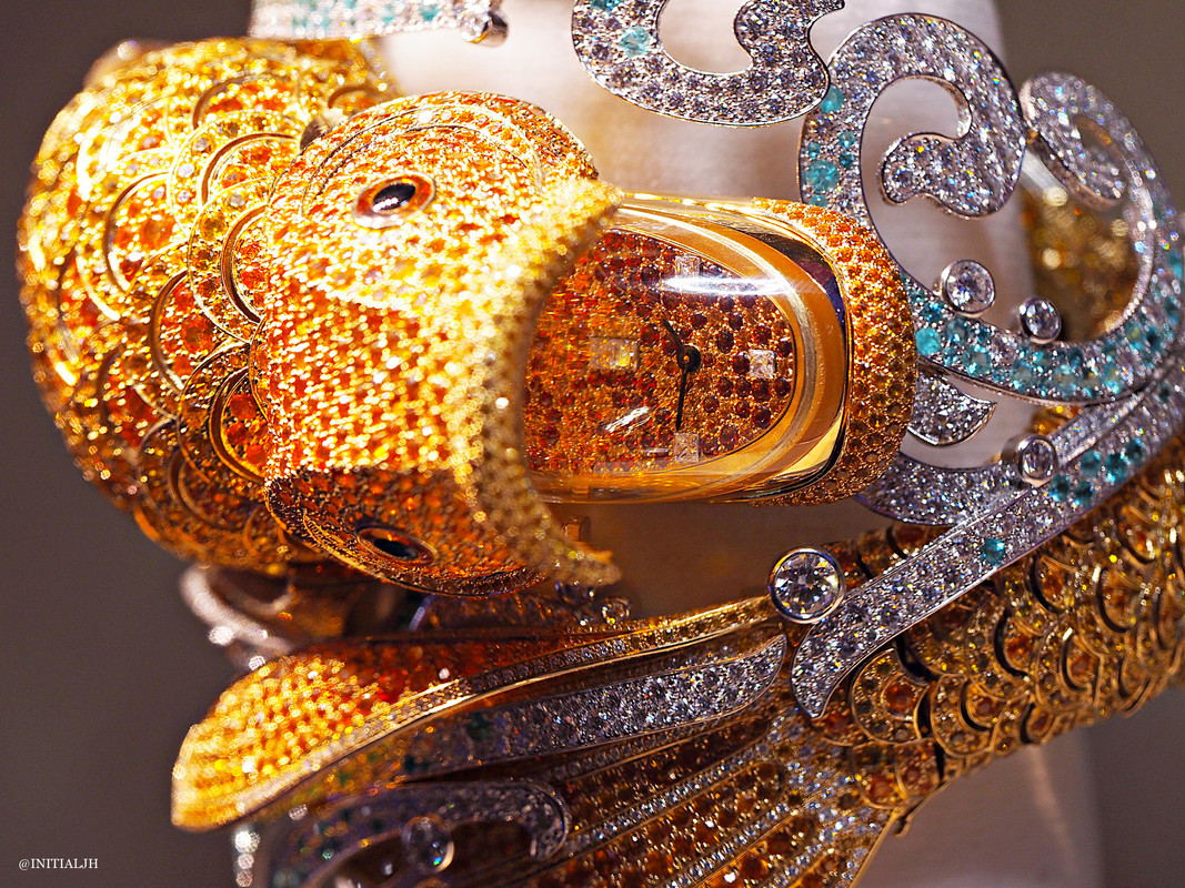 At the time I described, on instagram, the Koi piece as ‘bonkers’. It is. A quite frankly enormous piece of wristwear that is probably more suited as a display piece not on a human arm, it is set with EIGHT THOUSAND stones (diamonds, spessartite garnets, yellow sapphires, tourmalines, black spinels) and took a 3,450 hours to create. The watch bit of it is hidden discretely in the koi’s mouth. It’s quartz of course, and on another day I’d probably say that this is unfortunate, but telling the time via the opening of its mouth (on its head) is almost superfluous.