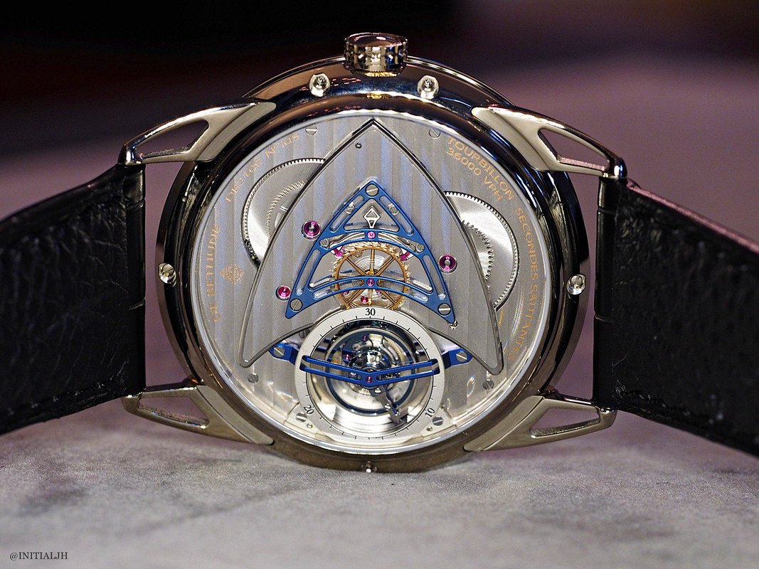Hidden from view on the back is the manual-ind 36,000 VPH DB2109 movement with a silicon-titanium tourbillon with 30-second indicator. The tourbillon comprises of sixty-three parts which weigh between 0.0001g and 0.0276g. The movement itself consists of 320 parts with ‘Côtes De Bethune’ blued titanium bridges and parts, silicon/ white gold balance and a power reserve of four days.