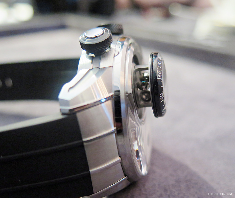 The Speedmeter is in a 44.70 mm Grade 5 titanium case, with a time setting crown at 4 o’clock and pusher at 2 o’clock to activate the anemometer function. It is water resistant to 30m with the speedometer closed and dust resistant even when the speedometer is extruding.