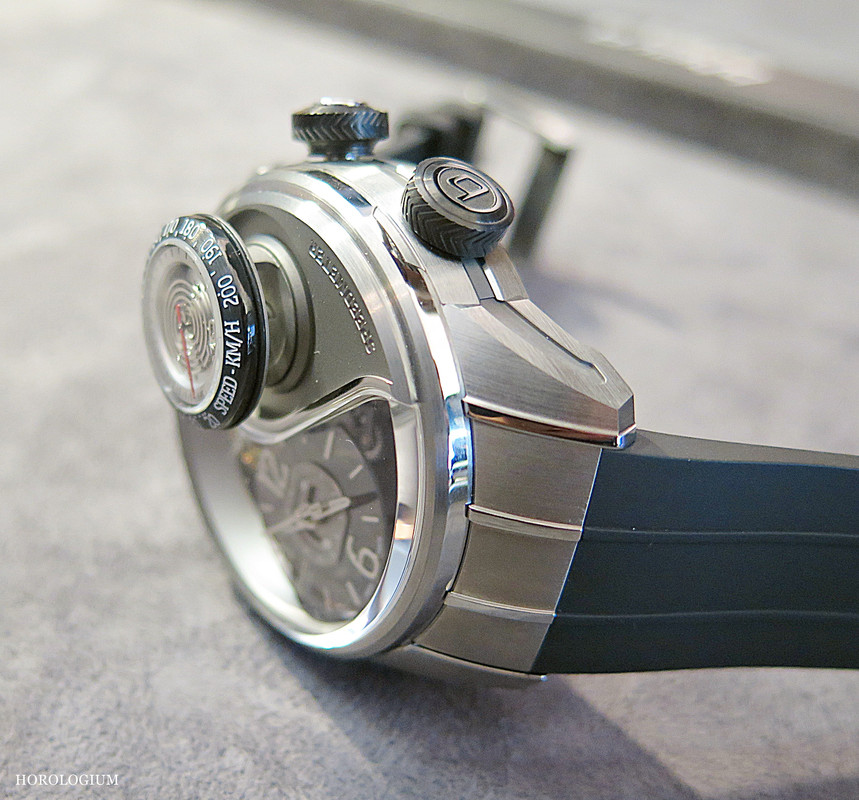 General functionality consists of hours, minutes, and seconds read on a smoked transluscent sapphire crystal dial with white gold indices at 7 o’clock. Then there’s the large speedometer dial between 1 and 5 o’clock, marked in km/h or mph. When the pusher at 2 o’clock is pressed, the speedometer pops up 6 mm from the dial, exposing the three titanium-alloy Robinson cups of an anenometer.