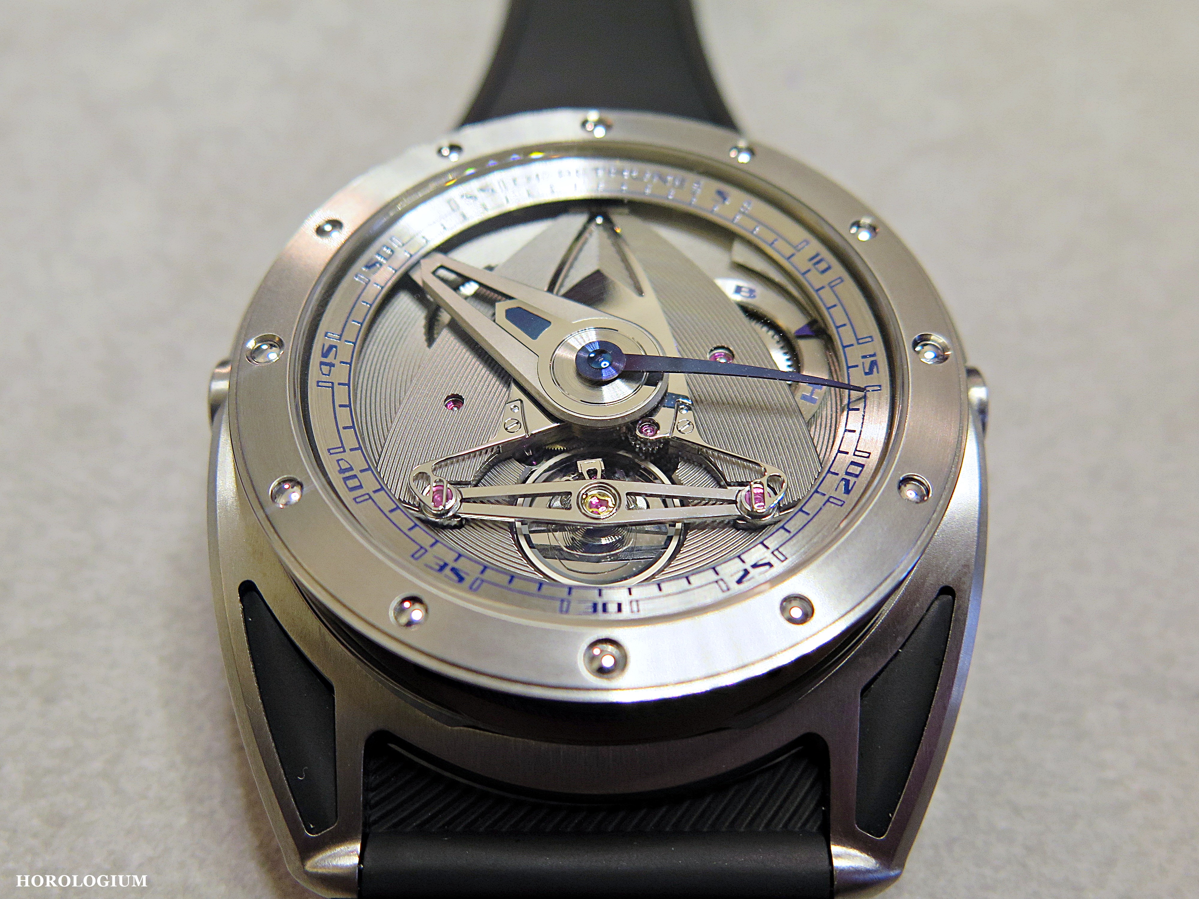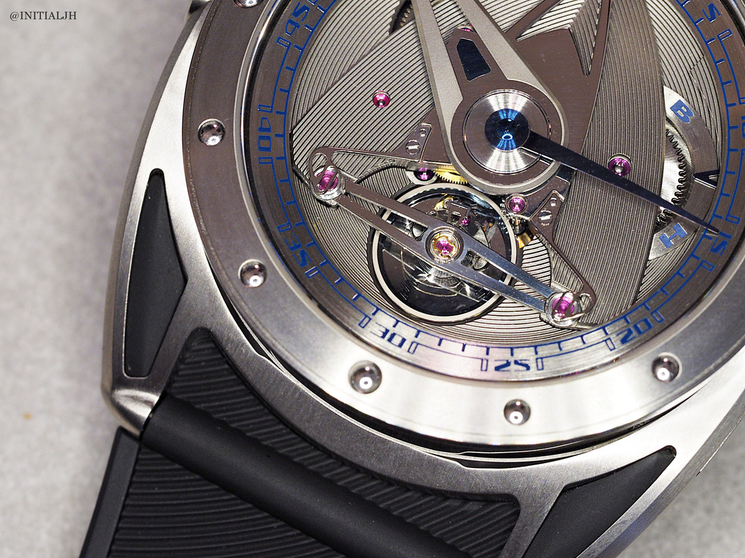 Designed by David Zanetta and Denis Flageollet, the signature DeBethune elements such as the lugs and ‘Star Trek’ deltoid shaped bridge are all present on the dial, which features both titanium and polished steel.