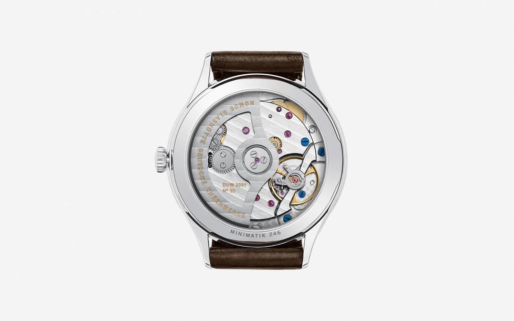 With a power reserve of forty-two hours, the new DUW 3001 has a Glashütte three-quarter plate, NOMOS balance bridge, 27 jewels, bidirectional winding motor, Incabloc shock protection, 21,600VPH, tempered blue screws, rhodium-plated surfaces with Glashütte ribbing, and NOMOS perlage.