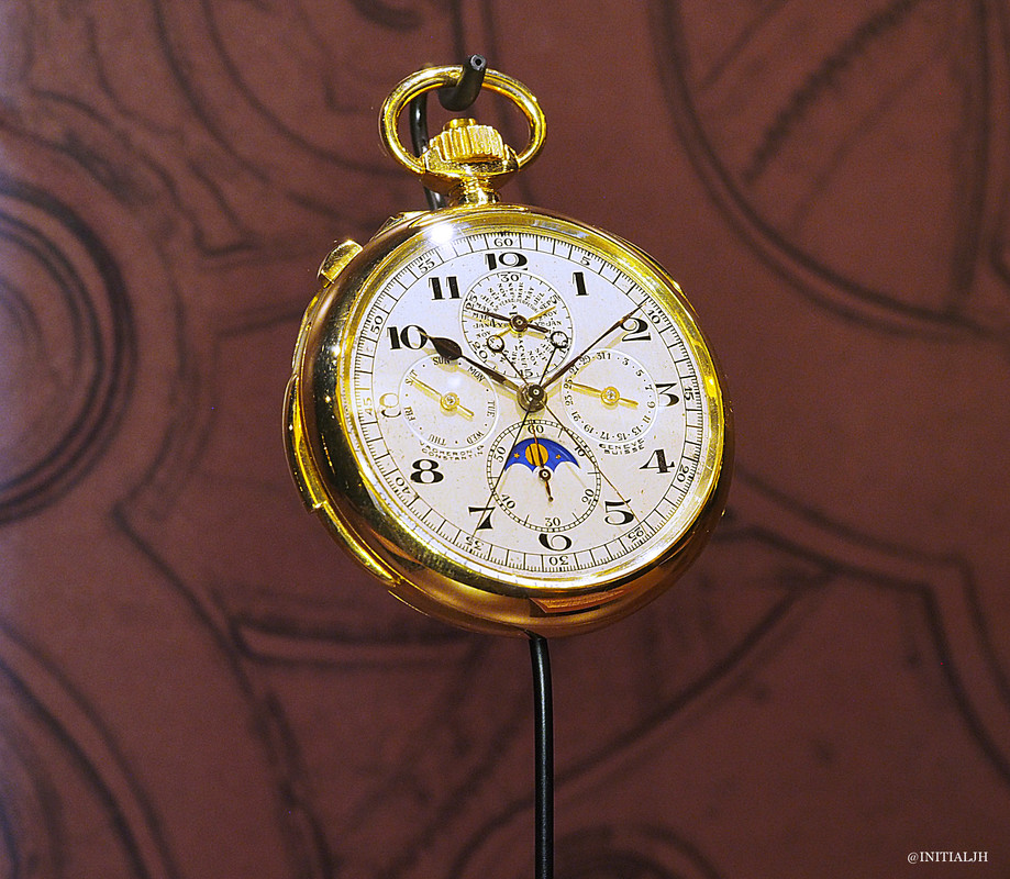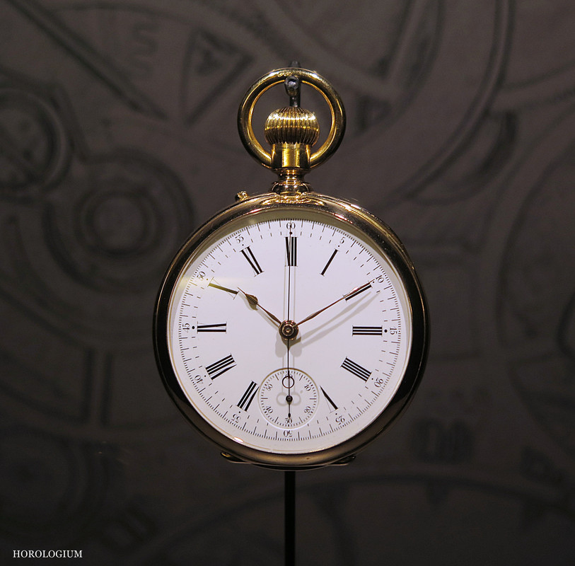 (1900) Minute counter chronograph, minute repeater. 18k yellow gold, enamel dial with Roman numerals, 30-minute counter at 12 o’clock, small seconds at 6 o’clock, external minute track, chronograph pusher in case band. Owned by Prince Louis Napoleon. Calibre RA 18″/ 19 chrono, minute repeater.