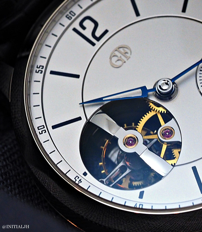 The tourbillon cage consists of 86 parts and with a cage weight of 0.38 grams, is inclined at a 25 degree angle, and performs a full rotation every 24 seconds (hence the name). The movement iis the Calibre GF01r which consists of 288 parts and has a 72-hour power reserve.