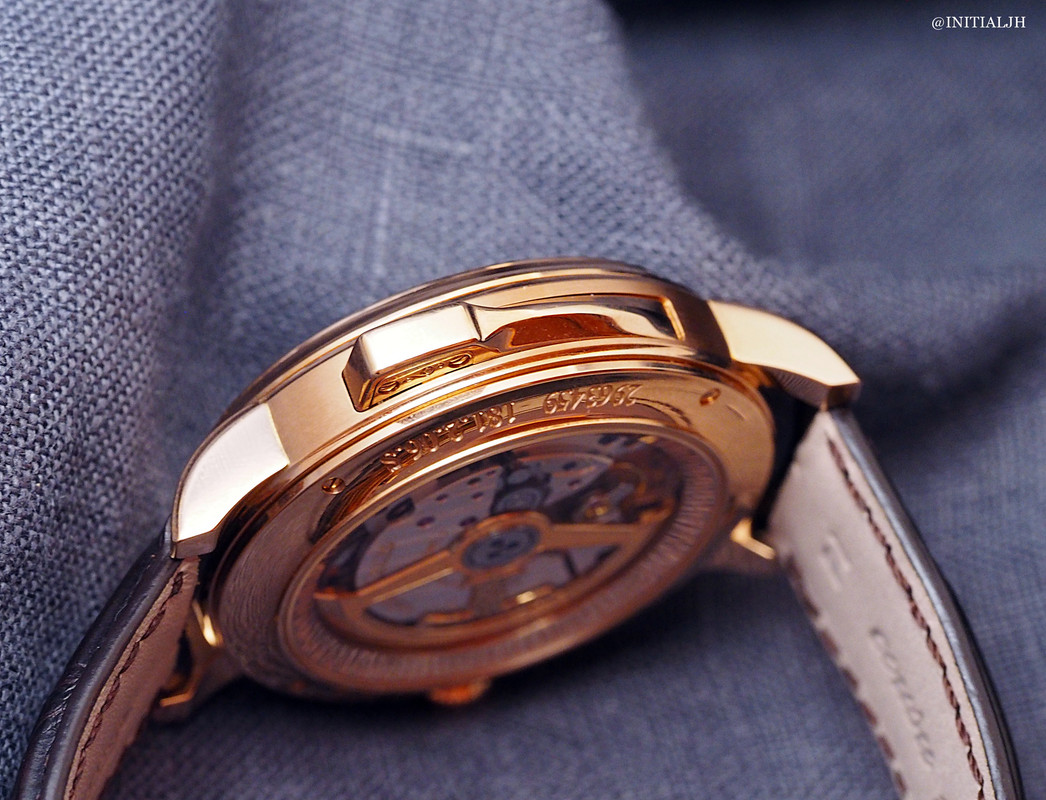 The case is a combination of polished and brushed parts. Its dial is silver grained which gives it some good textural interest, and its hour markers are applied pink gold. The dauphine hands are faceted, which means that one side is polished, the other brushed. It is very classic, elegant, and understated.
