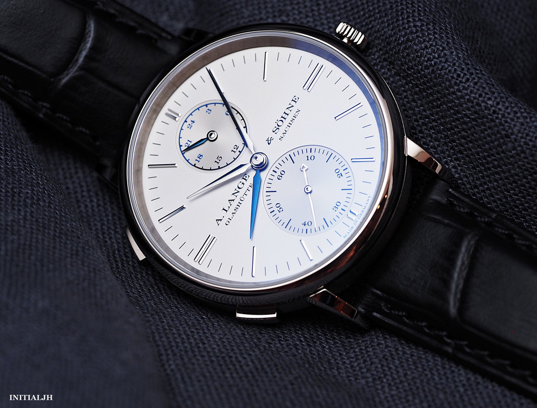 The new Saxonia Dual Time comes in either an 18k white gold or rose gold case that is, as mentioned, 38.5mm, with a height of 9.1m. Both the white and rose gold versions have a silver dial but the white gold model has rhodiumed gold and blue steel hands, whilst the pink gold model has pink gold and blued steel hands.