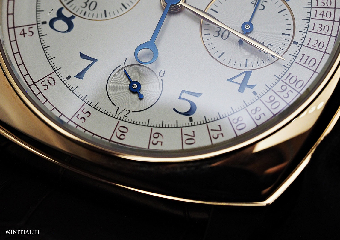 Firstly, the externals. The case is 18 carat 5N pink gold, and a very modern size, 42mm x 52mm, with a thickness of 12.81mm. The dial has a small seconds at 9 o’clock, a 45-minute counter for the chronograph at 3 o’clock, and a power reserve indicator at 6 o’clock.