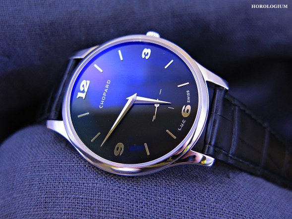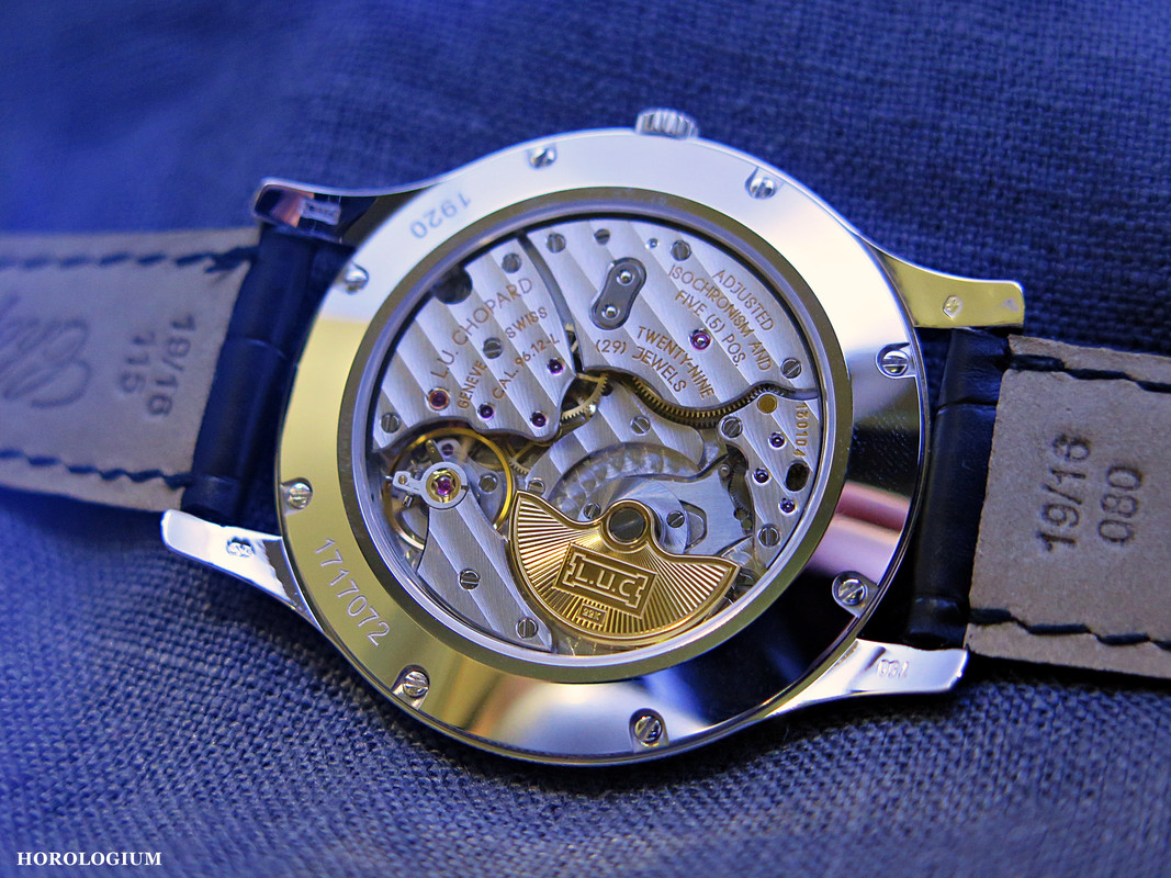 Inside is the automatic L.U.C. Cablire 96.12-L with a 65-hour power reserve and 22-carat gold oscillating weight, all visible through the sapphire crystal open case back. The movement is COSC-certified, with 28,800 VPH.
