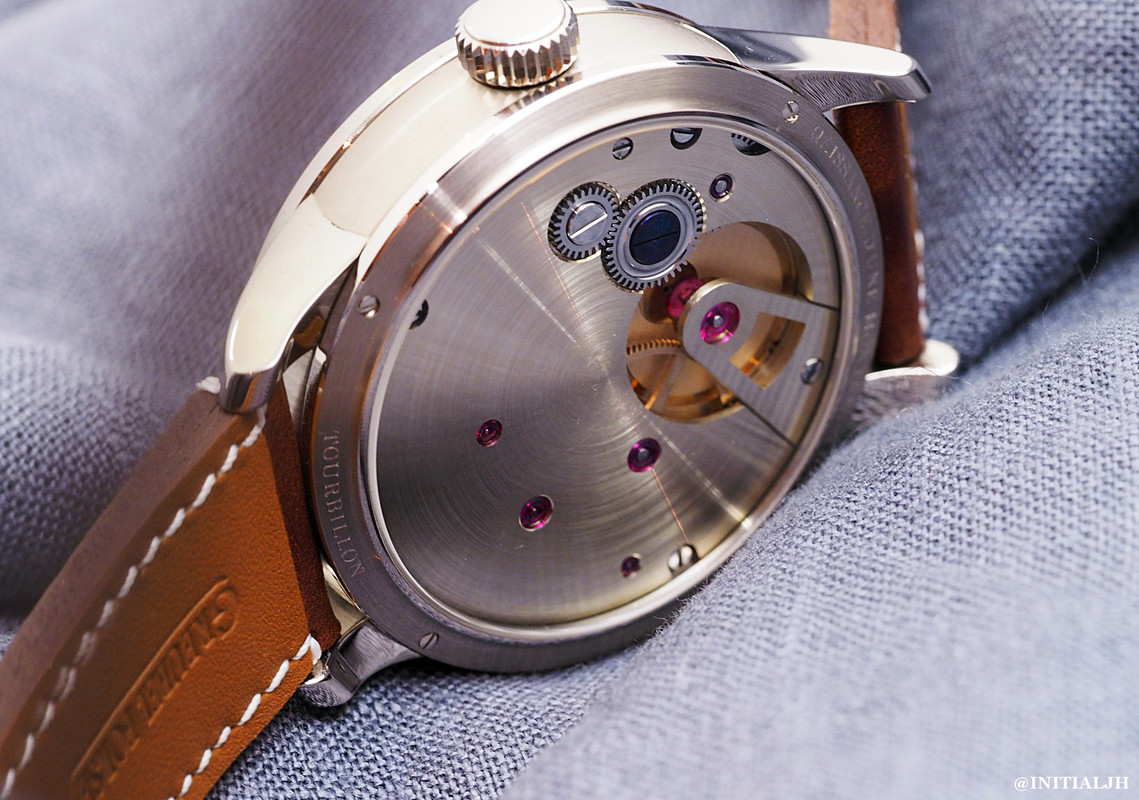 For this watch, which doesn’t remotely resemble anything that either Greubel Forsey or Dufour produce, they chose to make a manual-wind piece with the time, seconds, and a tourbillon. There are two separate dials for hours and minutes at 2 o’clock and a seconds dial at 8:30, both simple, with blued steel hands.