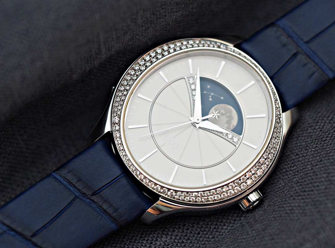 Designed and developed in both of Piaget’s La Côte-aux-Fées and Geneva locations, its display of the lunar cycle is via a two large moons framed by a diamond-set v-shape opening at 12 o’clock. Surrounding the moons you will see the celestial features of Ursa Major and Minor.