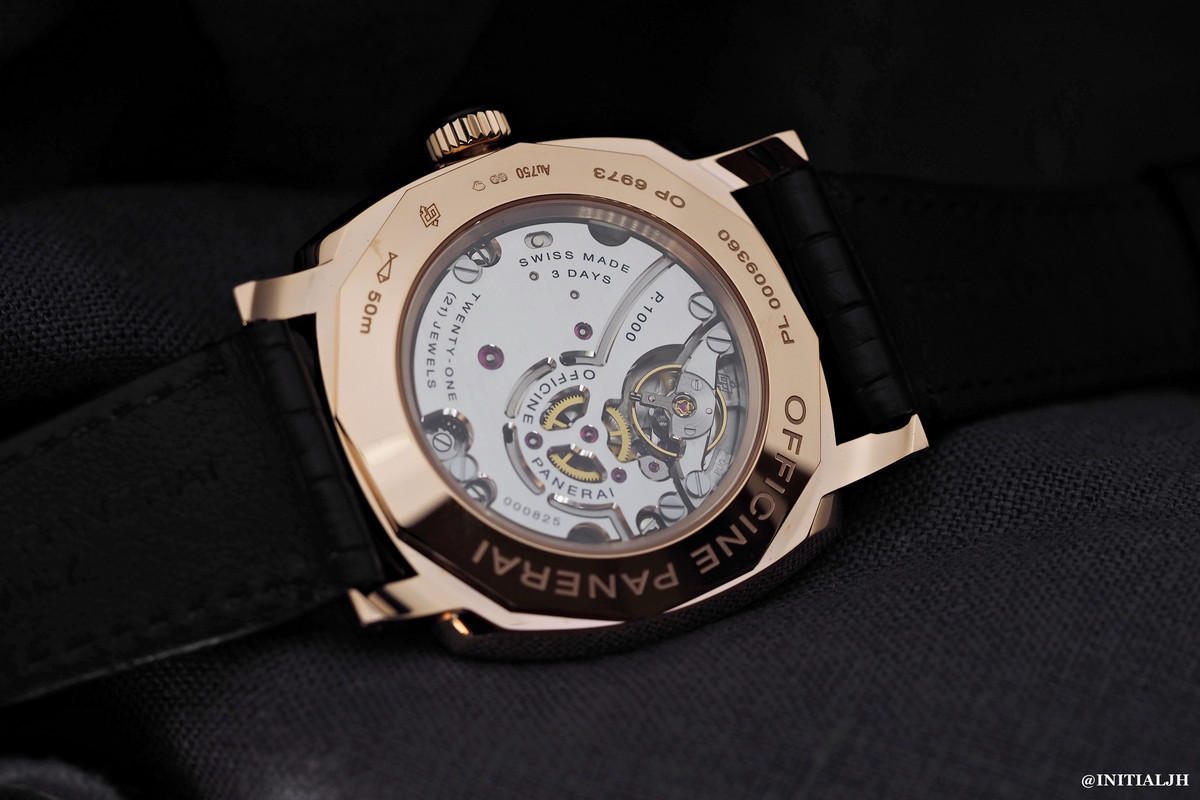 At Watches & Wonders 2015 Panerai officially launched new versions of the popular 42mm Radiomir 1940s that came out two years ago, containing the new manual-wind Calibre P.1000, replacing the P.999. The new movement has a seconds at 9 o’clock, a power reserve of three days (up from sixty hours, thanks to twin barrels versus single), beats at 28,800VPH versus 21,000VPH for its predecessor, and the most notable change, a seconds reset feature. For those who are unfamiliar with this, it stops the balance and ‘resets’ the seconds hand to zero when time-setting, to allow for perfect synchronisation with the reference time.