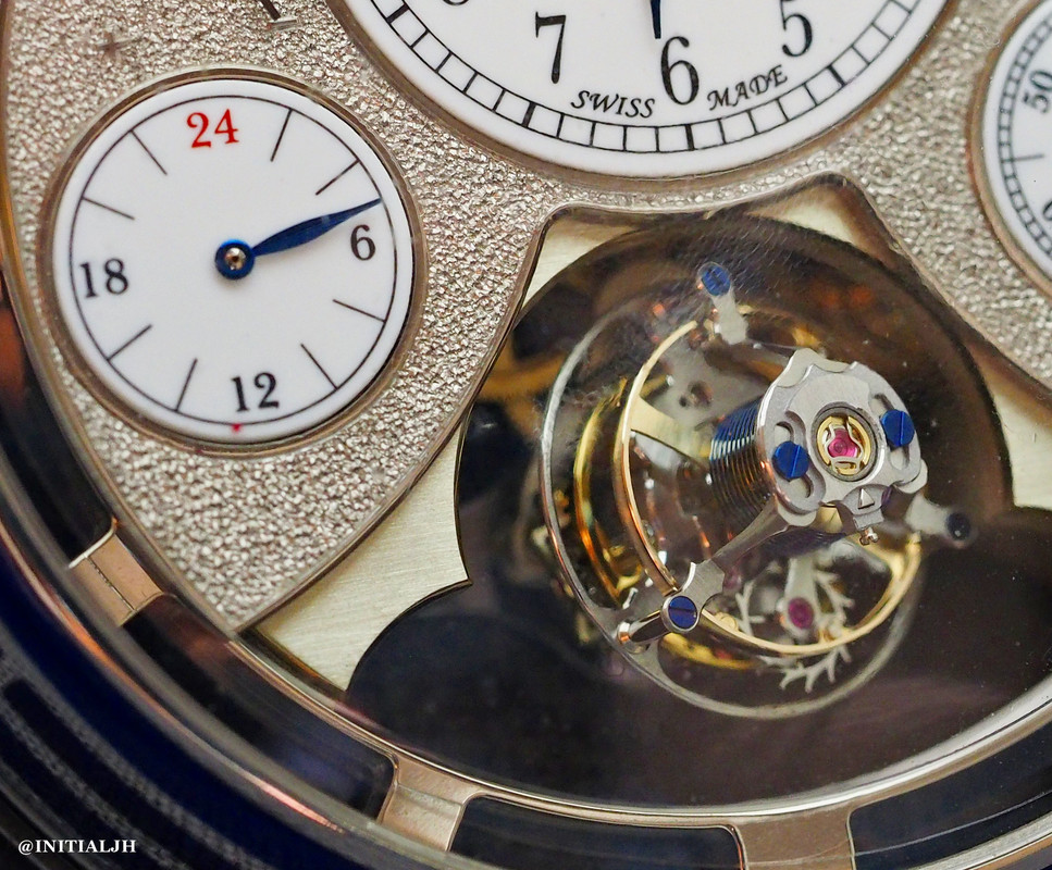 The first big change from the wrist version is of course the moving of the crown to 12 o’ clock, which now places the tourbillon at the bottom. As well as the time at 12 o’clock there is a second time zone on a sub dial between 8 and 9 o’clock, and seconds on the subdial between 3 and 4 o’clock. These three dials are grand feu enamel. There are also two slim power reserve indicators.
