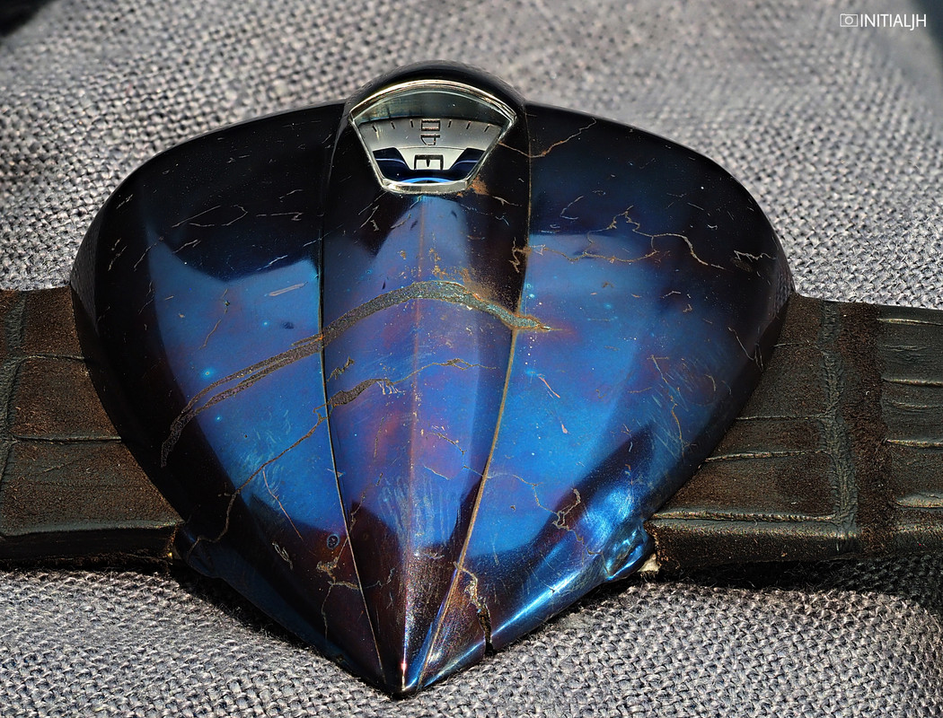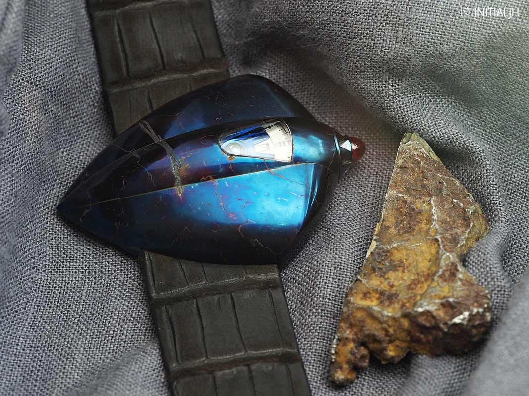 Yes we’ve written about a a few watches with meteorite over the last few years, but those were dials. This very singular watch has a case milled from meteorite. It took 2kgs of meteorite to get 500g of material suitable for this piece unique creation. The case was hand polished and then oven-baked. It took four months for the hand polishing alone.