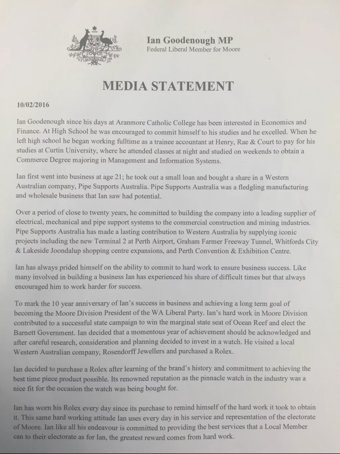 Time passed and an MP (who has subsequently issued a press release outlining the full history of his Rolex, see below), upon seeing Mr Macfarlane’s watch, told him that it seems real to him. So Macfarlane had his valued. It was real. The Clerk of the House was informed, Liberal heavyweight Tony Nutt was informed, and all the gifts were recalled and returned.