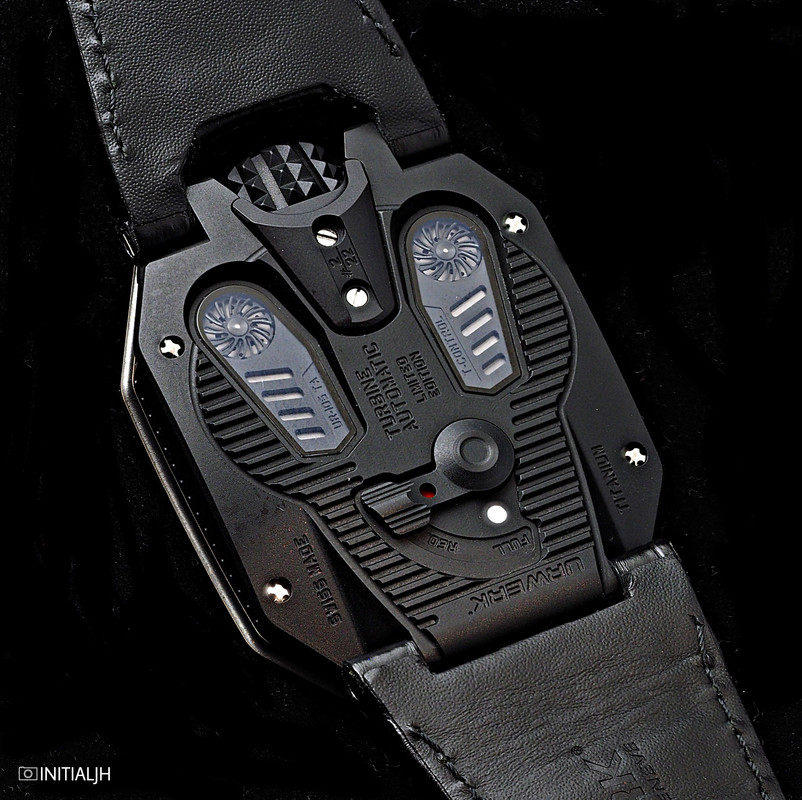 On the case back we find Urwerk’s usual ‘interactive’ component to their watches – turbines that allow regulation of the winding of the watch (with three positions: ‘FULL’, ‘REDUCED’ and ‘STOP’).