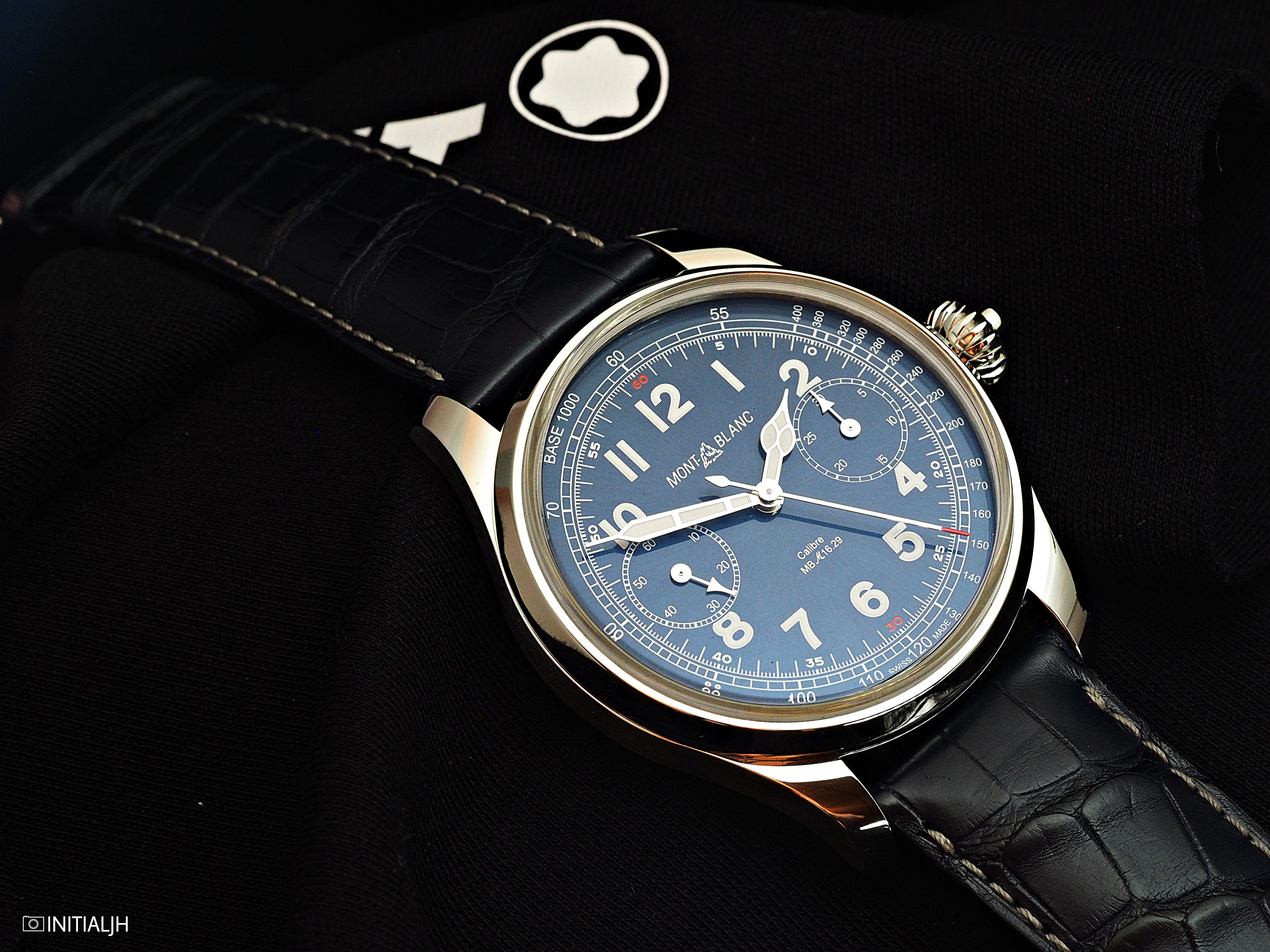 Inside is the manual-wind Montblanc Caliber M16.29, a pocket-watch style monopusher column-wheel chronograph, with both a large screwed balance and swan neck regulator. It is inspired by the Minerva 17.29 movement from 1929 and is hand-finished. As you can tell, if you are into watch photography then this will probably provide you with many hours of enjoyment. As @initialjh who photographed it likes saying, the devil is in the details – of the chronograph. The movement has 252 parts and you can see how much work has gone into it.