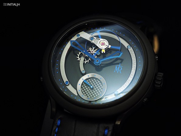 The Voltige 1770 is their entry model and thus there are no complications. Inside the 45mm x 13.8mm case (which prior to this new model came in stanless steel or rose gold) is the automatic Calibre MR05 with 40 hours of power reserve. This watch isn’t about the movement though, it’s about the attractive dial design, with both the escapement and the balance wheel up above the dial, a curved bridge that mirrors the lines of the case, and then the Manufacture Royale name which also curves, to balance the design. At 6 o’clock is the small seconds with an interesting grille/ grid decoration to it that breaks up the flatness of the dial with some visual contrast.
