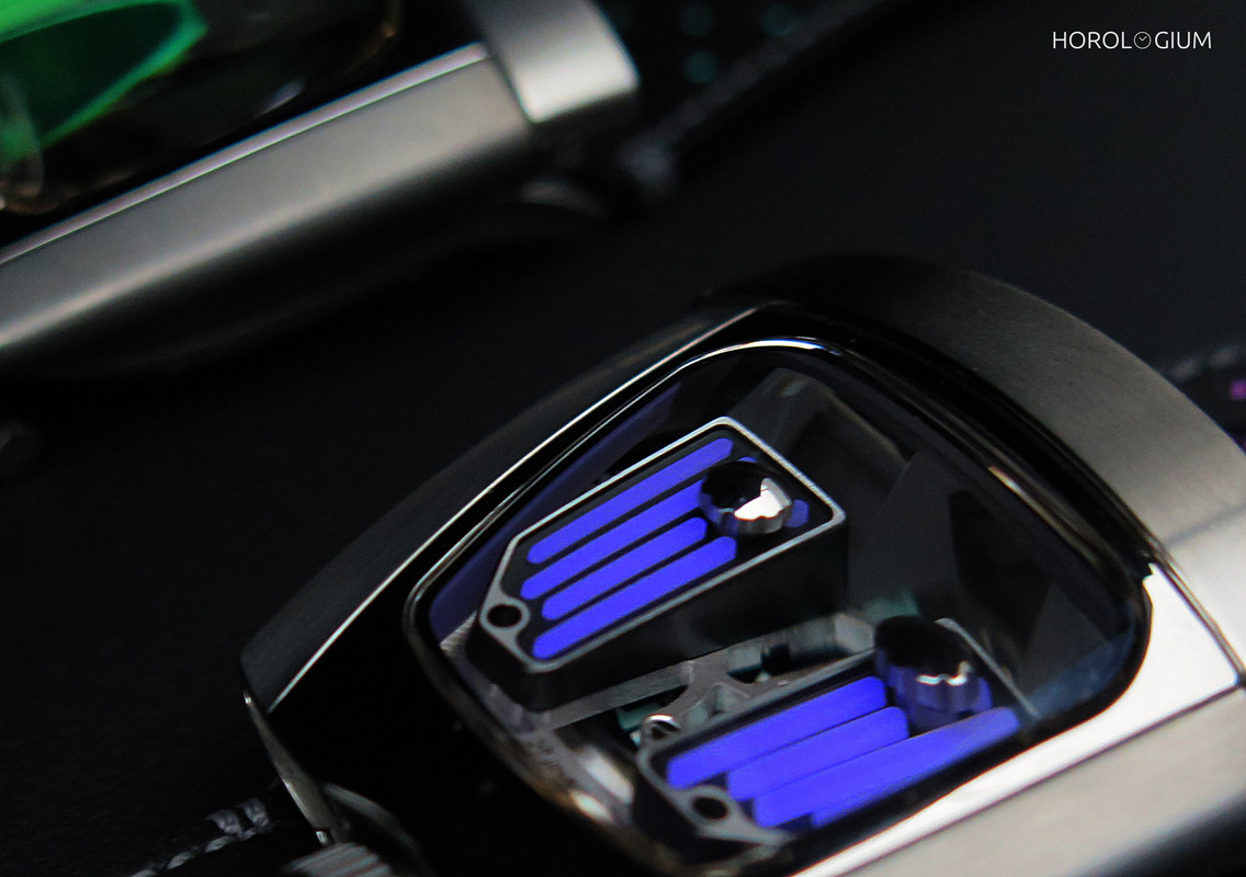Black Badger has combined with MB&F for two releases – a Starfleet Machine and these new HMX models. Thompson redesigned the cover of HMX’s engine, milled from his blocks of three differently coloured lumes, with the resultant new models called ‘Radar Green’, ‘Phantom Blue’ and ‘Purple Reign’.