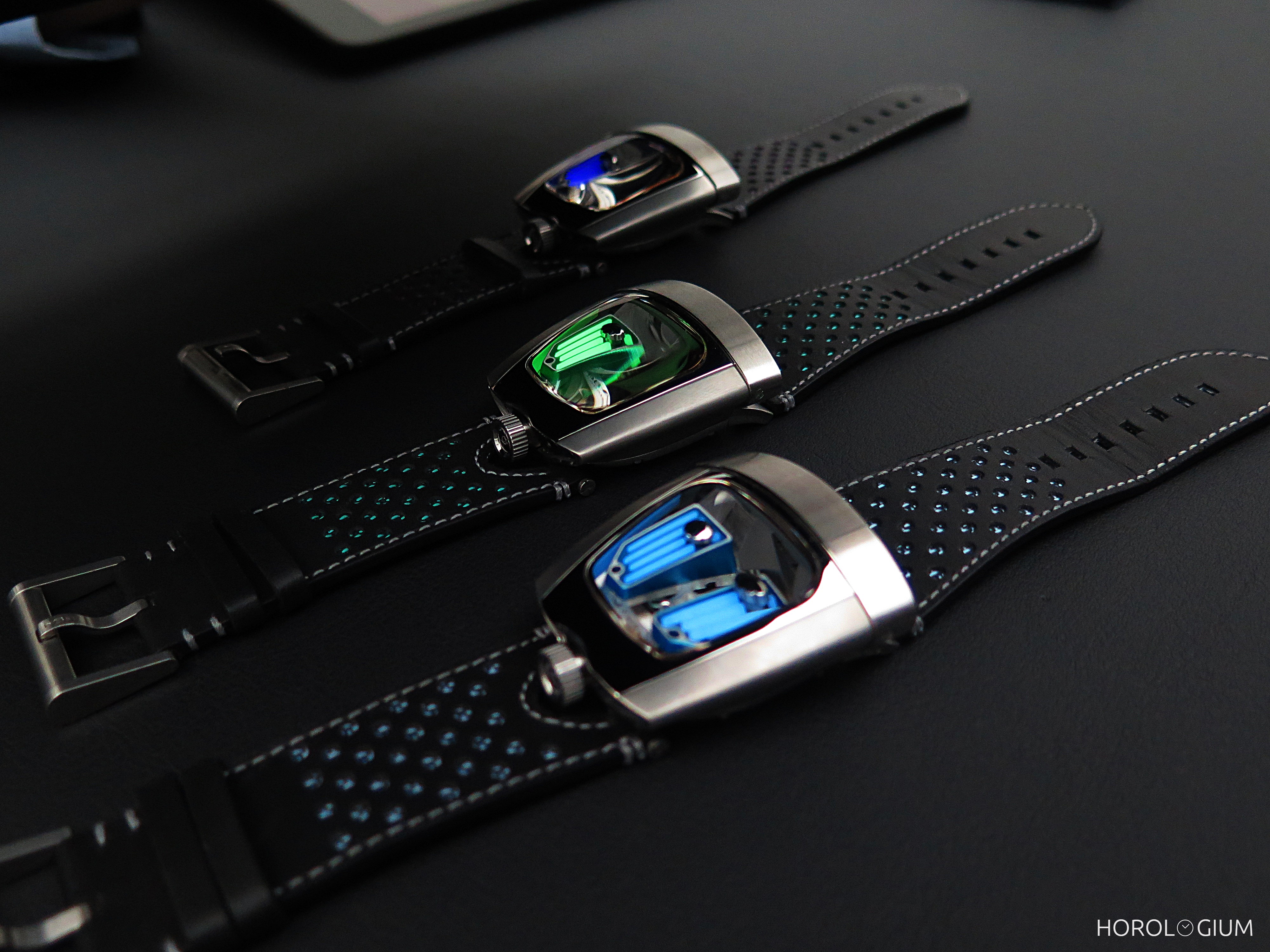The watches are fitted with partially perforated calfskin straps with a coloured layer under the perforations that matches the lume of the watch.