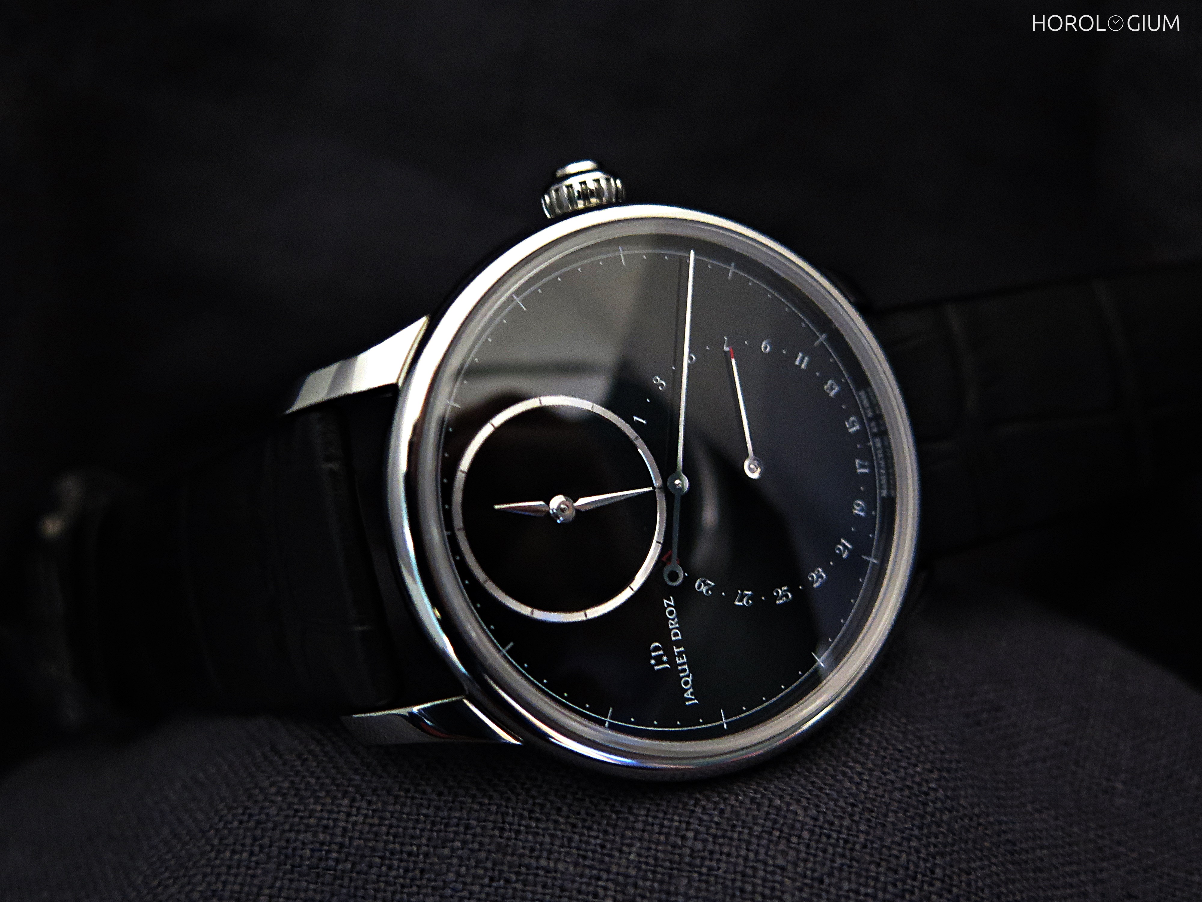 In 2015 Jaquet Droz released the Grande Seconde Morte (aka ‘Deadbeat Seconds’ in English) in a limited edition model with an ivory-coloured enamel dial. A year later at Baselworld 2016 they followed up with two black dial versions in stainless steel (onyx) and rose gold (black enamel), and it is the former that we are sharing with you today.