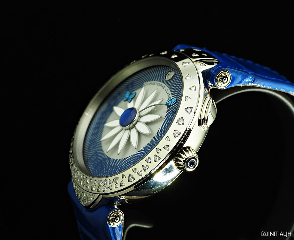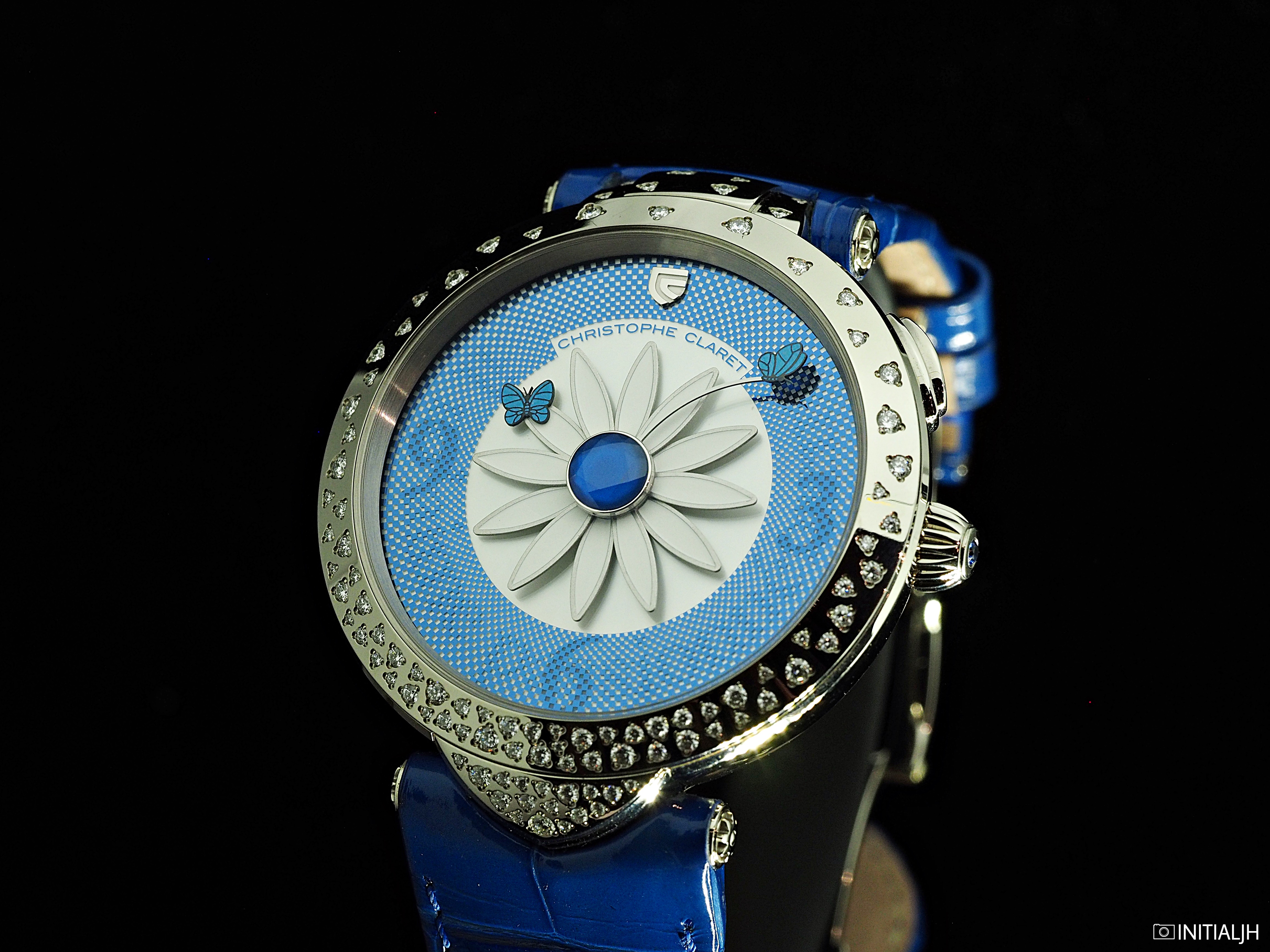 The daisy is of course,the focus, its petals white lacquered and with two butterflies in blue, green or red SuperLumiNova depending on the iteration, attached to a matching ruby, emerald or sapphire pistil, as time indicators.