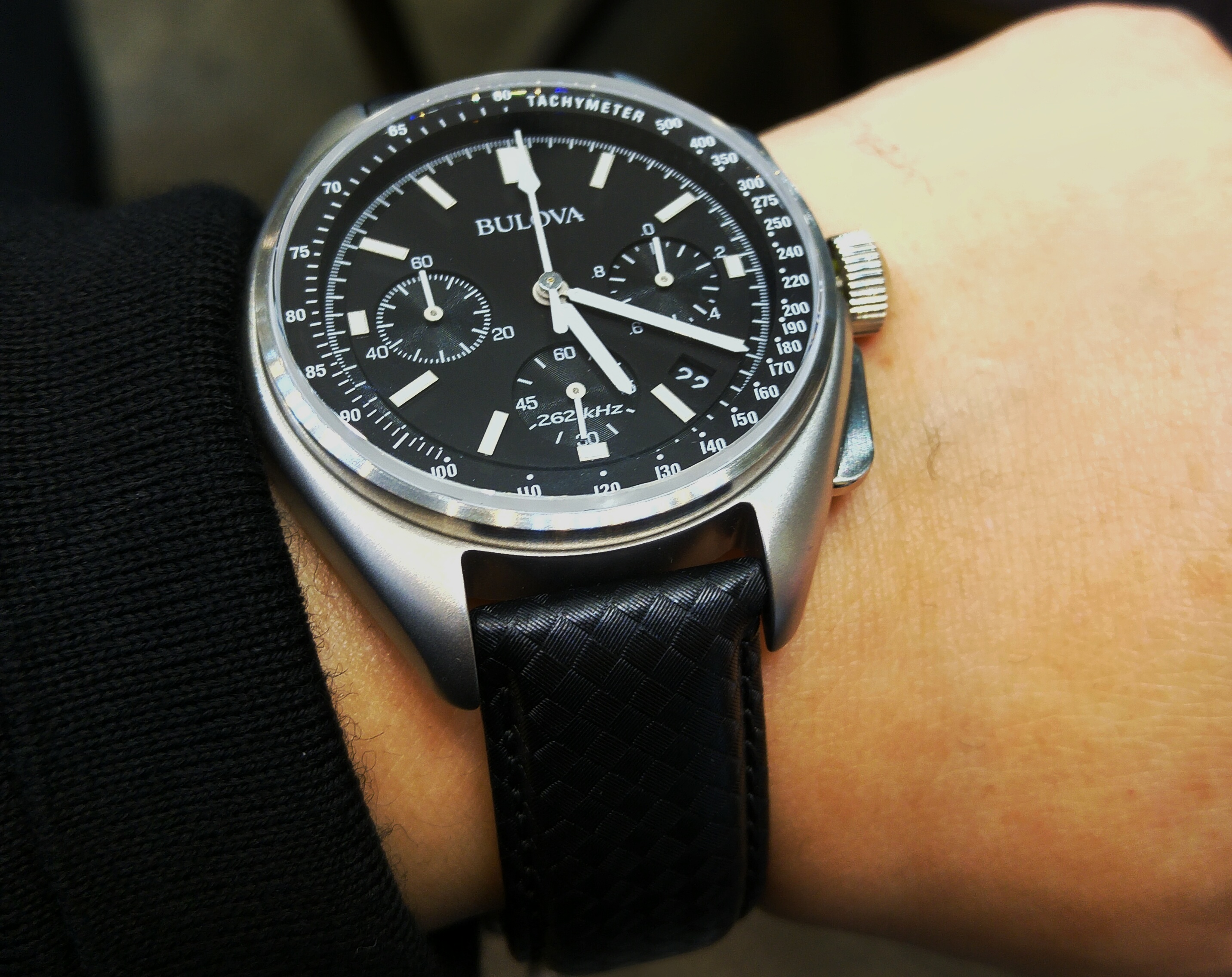 You may recall a post late last year about an impending re-edition by Bulova of the watch Apollo 15 commander David Scott’s Bulova that he wore on the third of his 1971 moonwalks. The re-edition was purportedly going to be available from January 2016, but ended up having its launch at Baselworld 2016, and it is now available in Australia. I visited a Sydney authorised dealer to take a look, and here are some quick phone photos of it.
