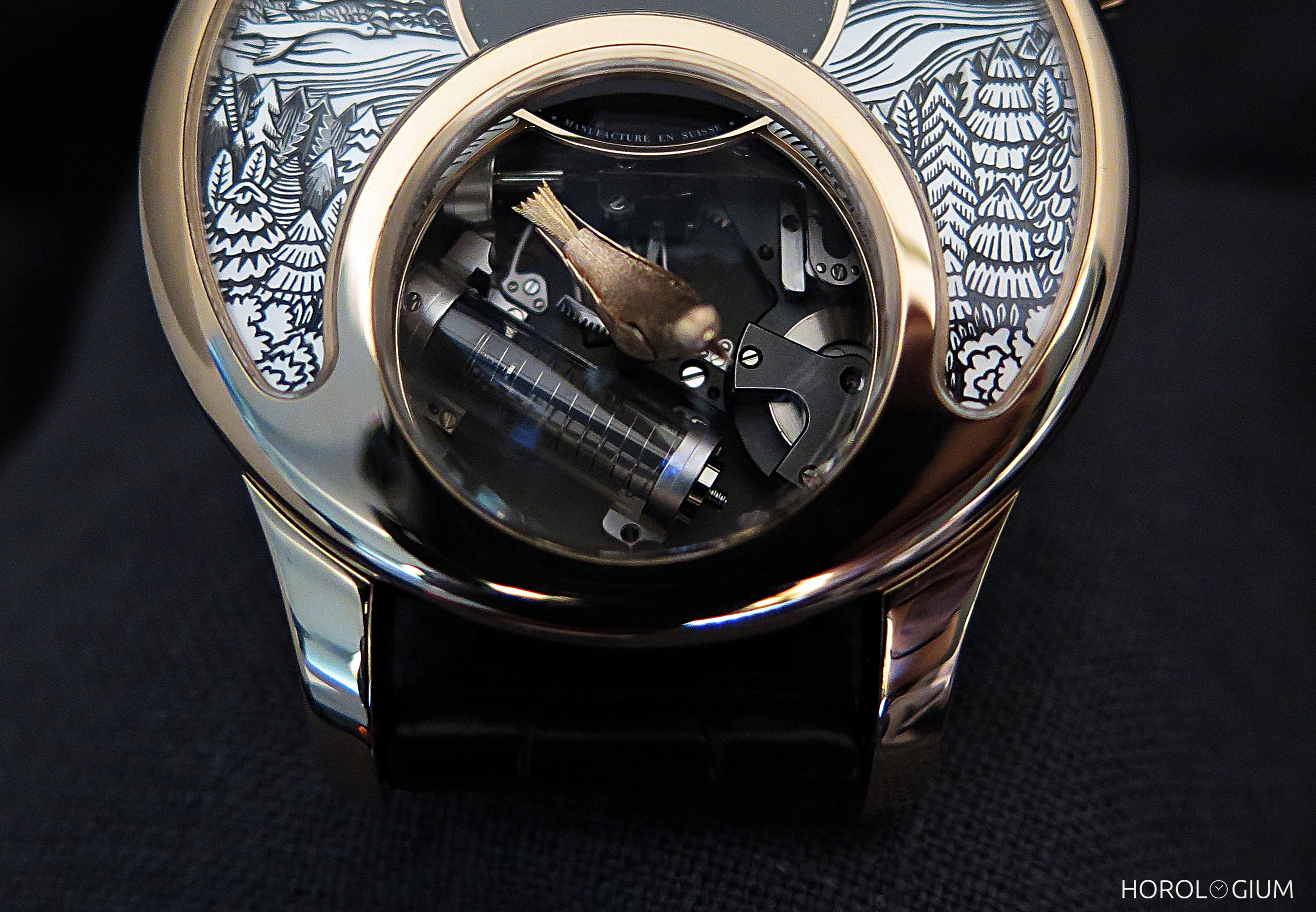 As you can see, the upper part of the dial displays the hour and minutes on a black onyx sub dial whilst the bottom is dominated by the lifelike hand-engraved singing and wing-flapping (Tit) bird, protected by a sapphire crystal dome. Surounding both of these is a hand-painted and engraved mother-of-pearl dial depicting the Swiss countryside, inspired by traditional paper-cutting techniques. This new watch is in either 18 carat red or white gold versions, and today we are showing you the former.