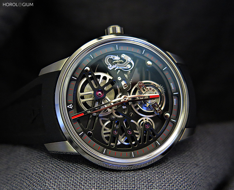 The many layers of this watch aren’t just about the skeletonisation but also involve a multi-stepped bezel, with black, greys, red imprints, and a flange with an index and chapter rings. The colour scheme is extended to the hands.