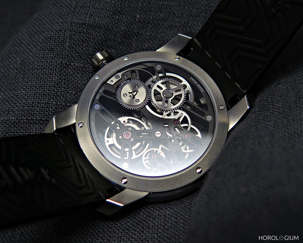 As is most evidenced when you turn it over and look at the back, this is an incredibly contemporary watch, an incredibly contemporary example of skeletonisation, with snailed black ADLC coating and chamfered edges making the movement’s strong looks really rather attractive to anyone with a streak of fondness for this sort of high-tech look.