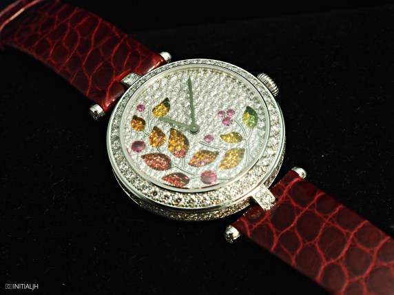 The Lady Jour des Fleurs is available either on a burgundy alligator strap as per what we saw, or an astonishing matching jewelled bracelet which is also bedecked with diamonds and uses the same coloured stones for more leaf depictions.