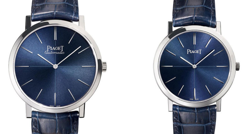 Both of the new Altiplano anniversary models have a deep blue sunburst dial in a blue that has been strong part of Piaget’s history and which will be familiar to many. The blue cross is also a nod to the past, as is the use of “Piaget Automatic”, which appeared on their first ultra-thin watch. The white gold of the case is carried through to the hour markers and baton hands.