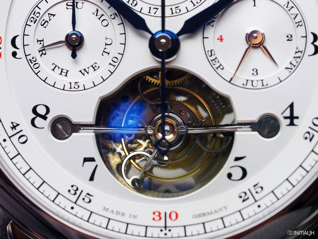 However, it is not the Lange way to do things simply when it comes to movements, and there has basically been a new Calibre L133.1 movement created, consisting of 684 parts. They have built the perpetual calendar mechanism around the tourbillon (i.e. an integrated movement rather than using a module) and emphasised the minimal loss of energy even if the chronograph is in use when the calendar, which is accurate until February 2100, is being adjusted. Additionally, there have been adjustments to the fusée and chain to counter the loss of torque at the mainspring via a planetary gearing mechanism that maintains a constant force from the mainspring barrel when the watch is being wound.