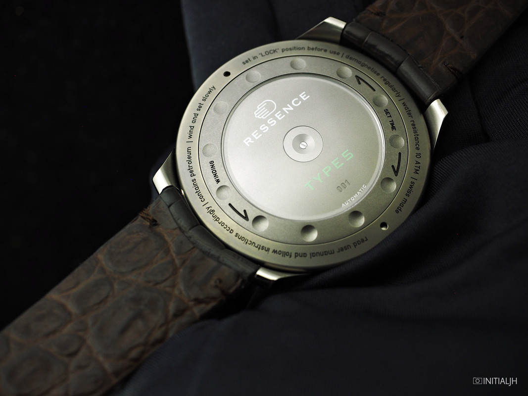 The increase in size was for practical reasons – the addition of a rotating unidirectional diving bezel. Ressence’s trademark no-crown concept is still here, meaning that adjustments and winding are via the rotating case back, but for water resistance related reasons, a new (clearly marked) lock was introduced to the Type 5 (which they call the ‘Ressence Compression Lock System) that is for locking and compression of the gasket.