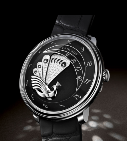 At Baselworld 2015 Fabergé and Agenhor launched the Lady Compliquée Peacock. With a retrograde time display at its time telling centre, there are fanned blades that spread the peacock’s feathers gradually over the course of an hour, indicating the minutes on a scale and the hours via a rotating ring, with the four moving blades flying back to their original position with the passing of an hour.