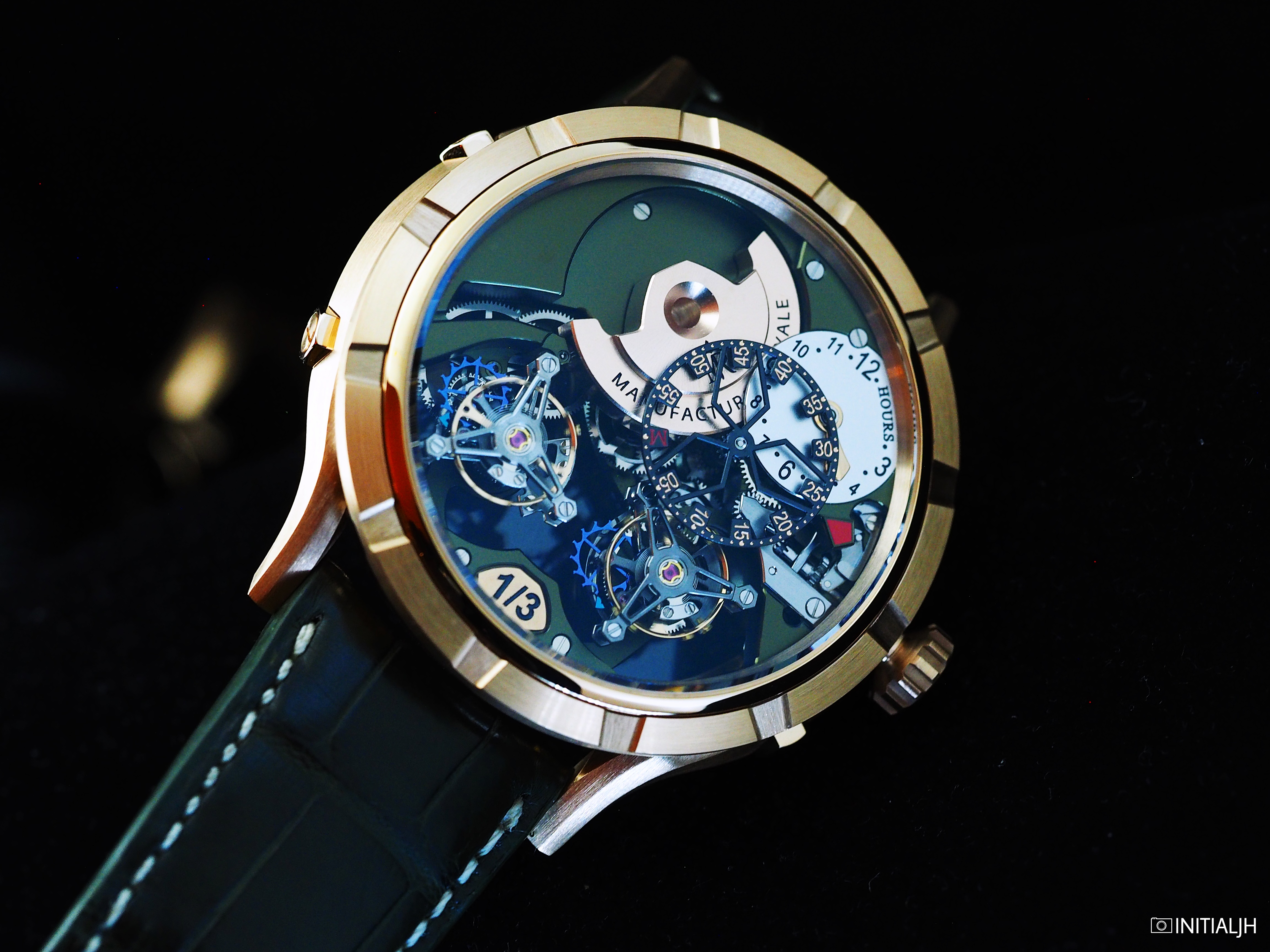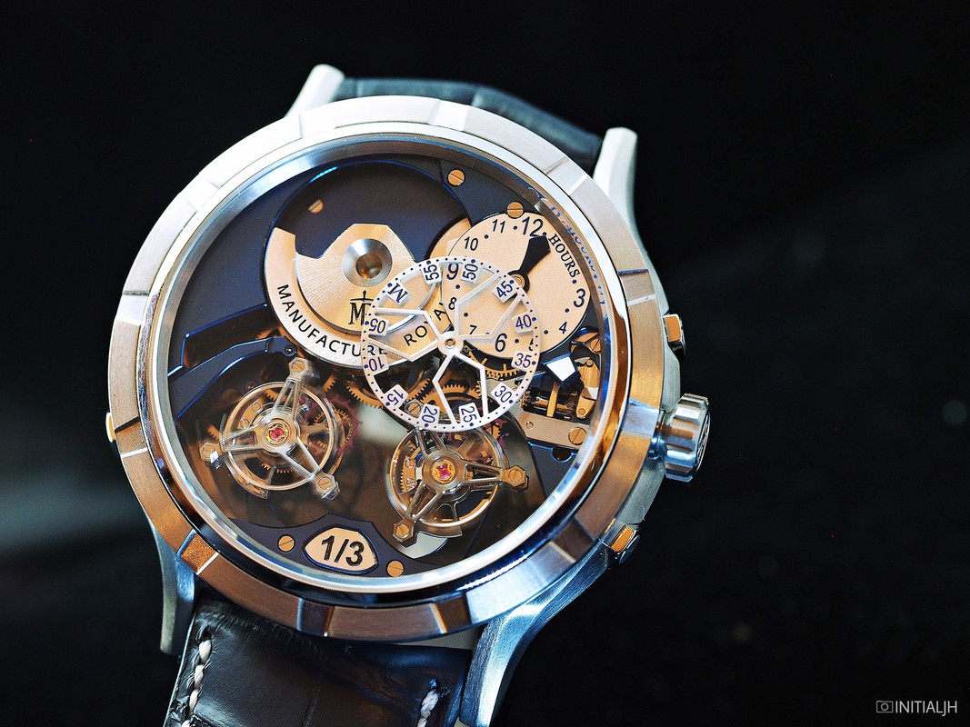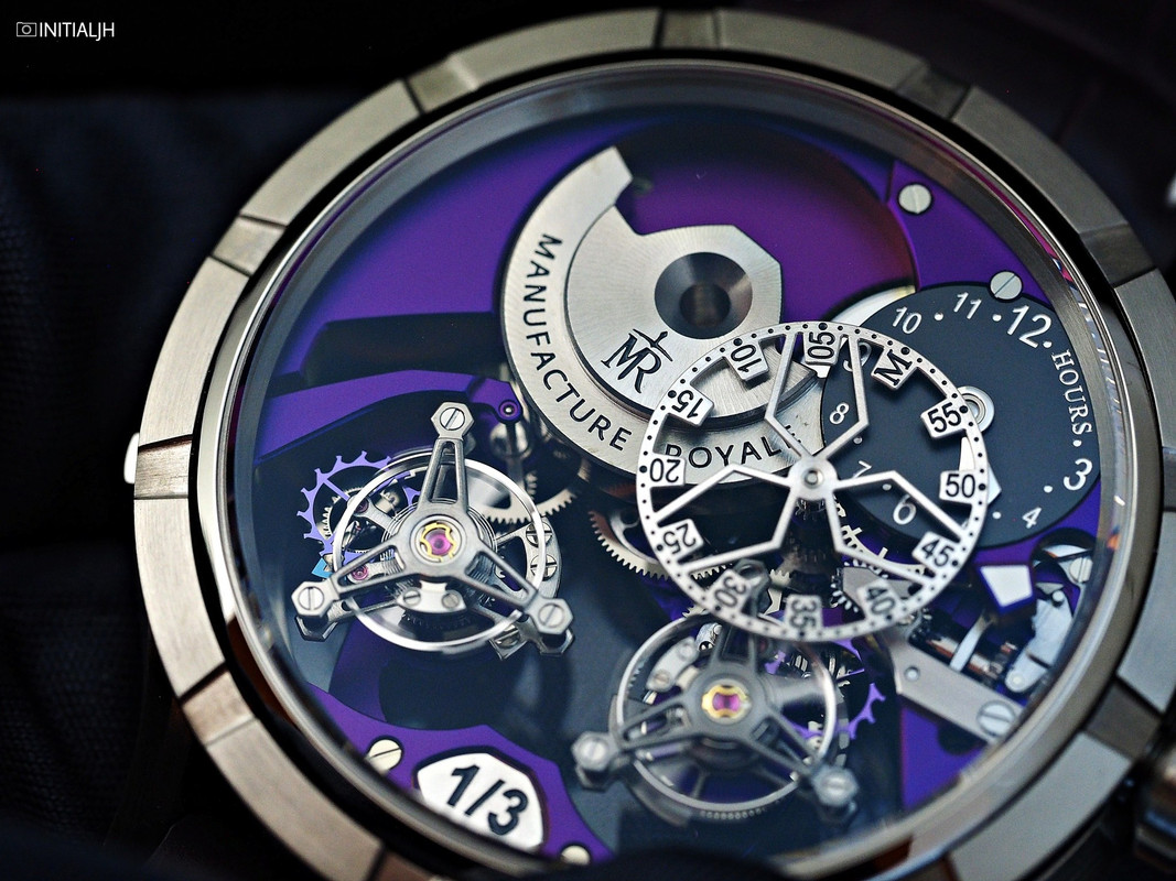 You may recall our earlier post about the 1770 Micromégas. It was Manufacture Royale’s first watch containing an automatic in-house calibre and also had another first, a double tourbillons with two different speeds – the left a six second revolution tourbillon and the right, a more common one minute one, connected through a differential which draws power directly from the same barrel.