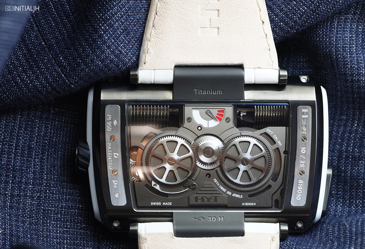 In 2015 HYT launched a radically new look to their liquid display watches in the form of the H3, with a linear time indicator using two bellow mechanisms located on in the top right and left corners of the case.