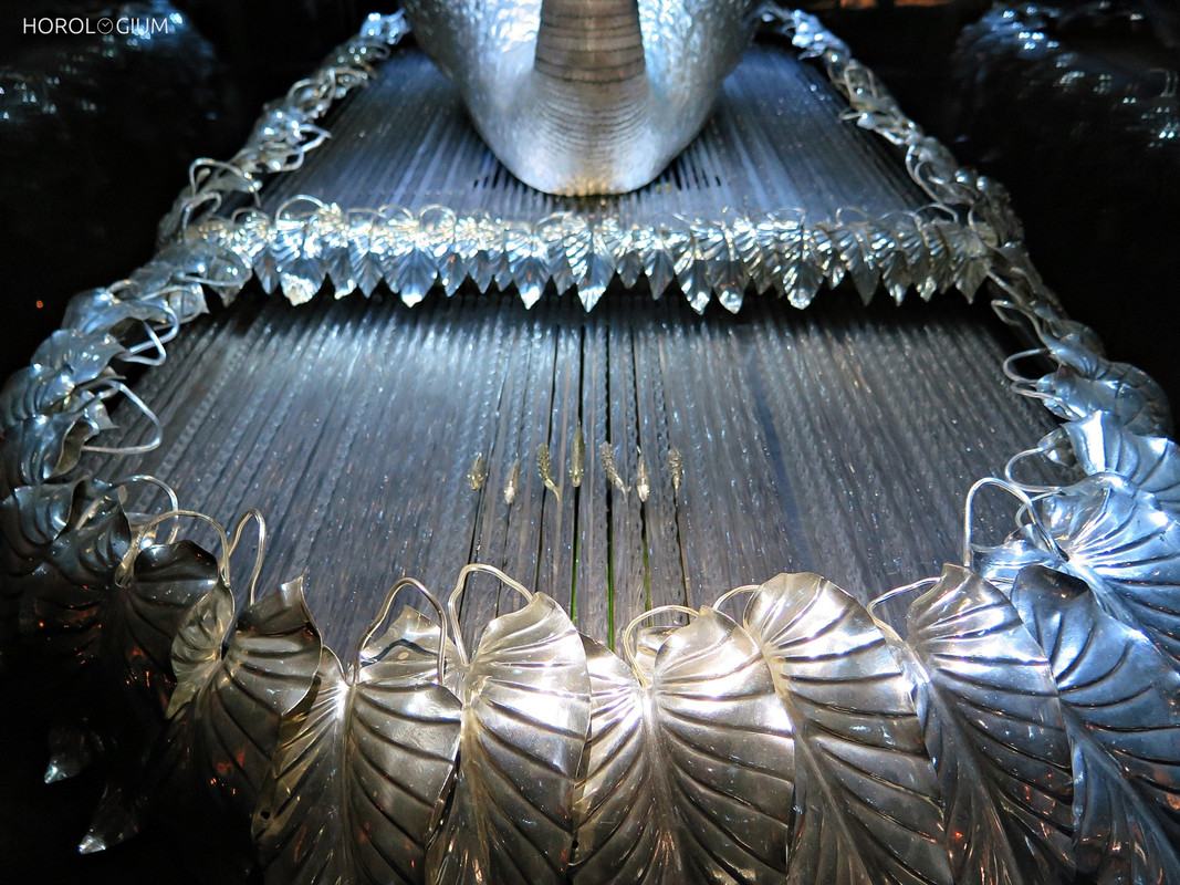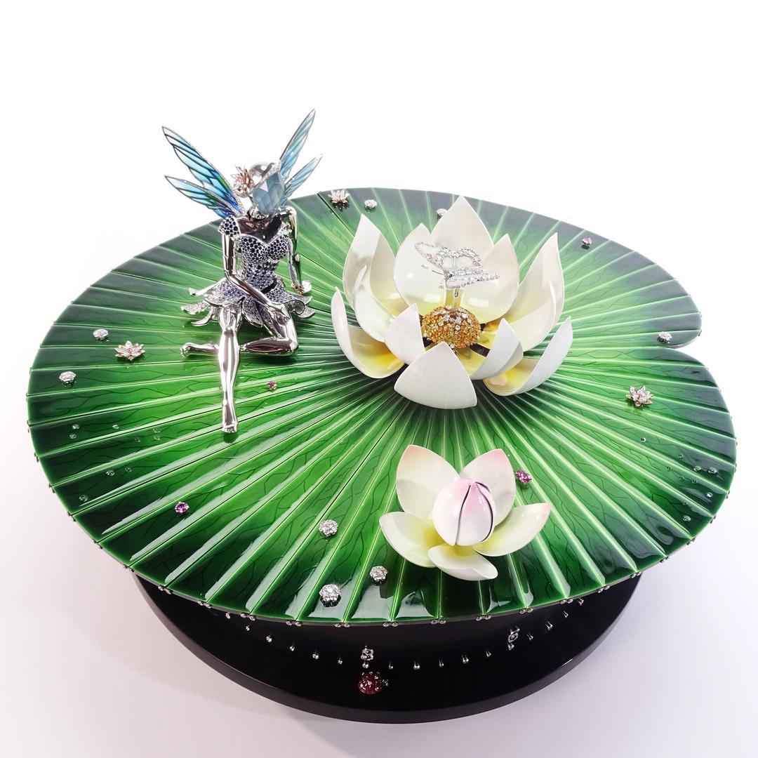 So apart from sitting in jewelled splendour, what does the Fée Ondine do? The automaton is wound, then activated. This leads to the green enamel lily pad’s leaves, which are composed of sixty blades in a fanned arrangement, starting to ripple. The lily petals open, the fairy’s head and wings becoming animated as she is awakened by the music to admire the fluttering butterfly that rises from inside the lily. This lasts for about fifty seconds before the butterfly lowers itself, the petals close, and the fairy returns to her original position.