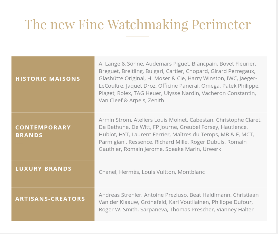 A total score of six and above is needed for a brand to qualify to be within the FHH’s “fine watchmaking perimeter”. Of the 86 brands evaluated by FHH, 64 were granted entrance inside the perimeter.