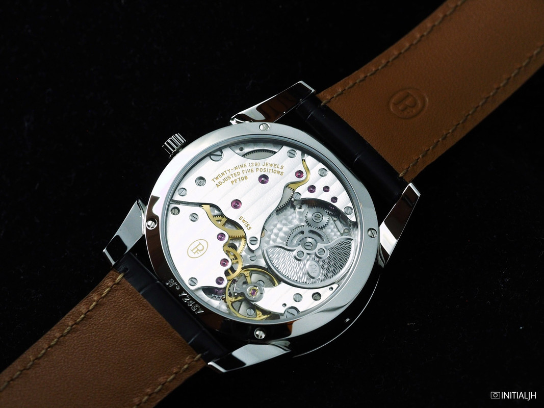 Through the back you can see the automatic Calibre PF708 automatic, a variant of the PF702 used in other versions of the Tonda 1950 range with the new additions of a date complication and moon phase indicator via a module. The movement beats at 21,600VPH and has 48 hours of power reserve.