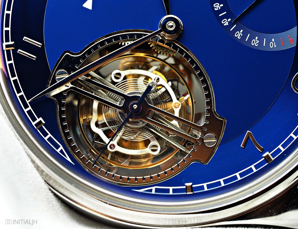 At 9 o’clock is the 60 second tourbillon with constant-force mechanism built into tourbillon cage.