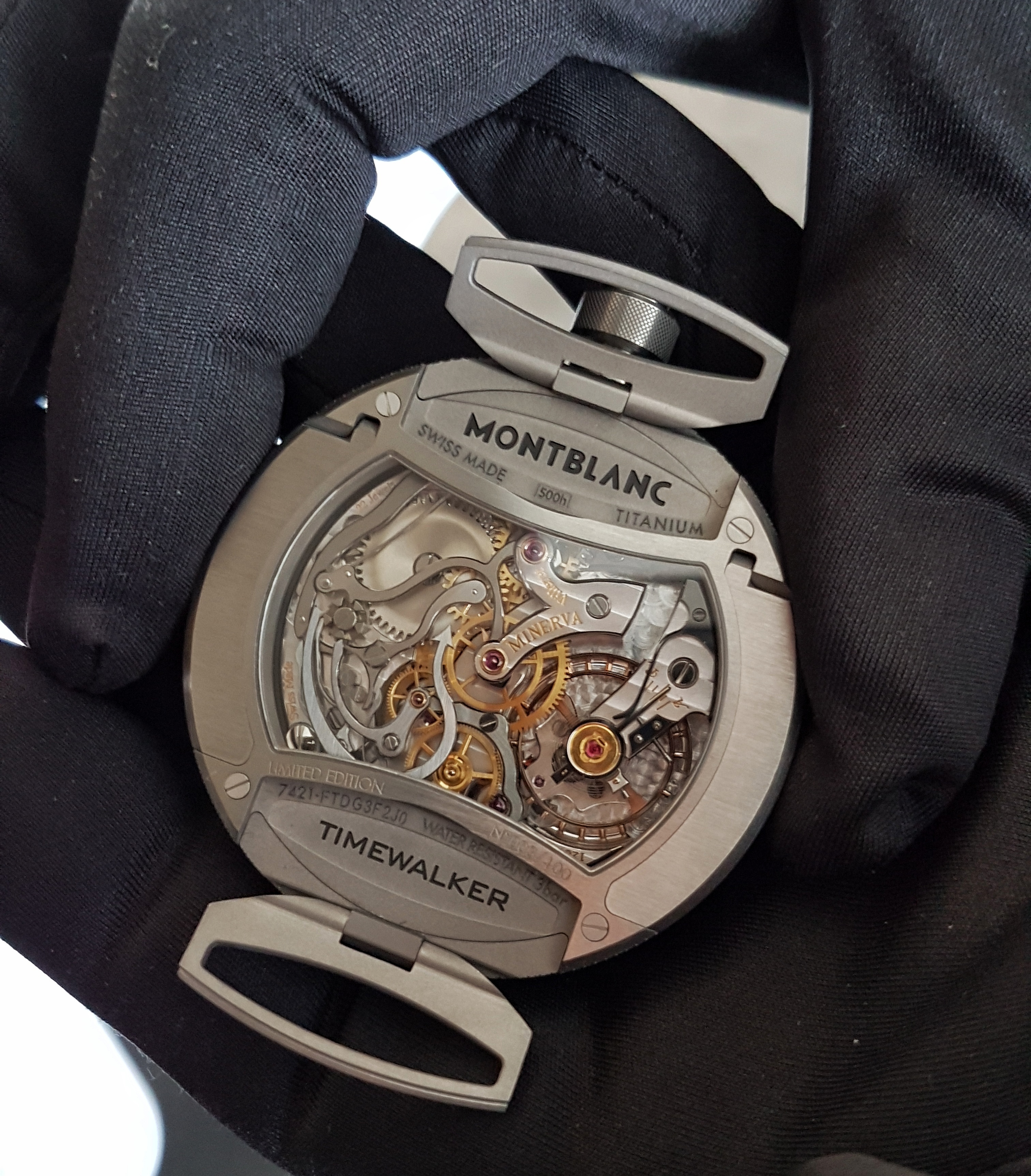 As you will note from the pocket and desk options open to owners, this isn’t a small timepiece. In fact, it’s 50mm, and 15.20mm thick. However, the case is made of Grade 5 titanium, rendering it lighter than many stainless steel watches. If you look at it from the side, you will notice that the middle section has been knurled and coated with black DCLC. The crown is titanium, the monopusher titanium with knurled finishing.