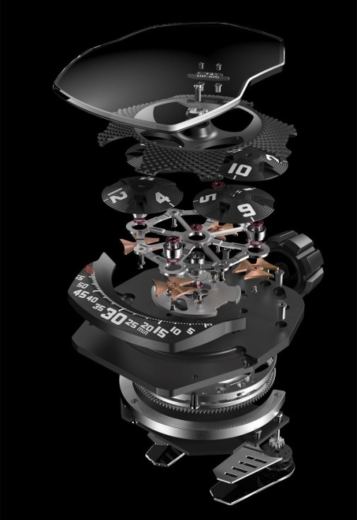 The 53mm long, 39.5mm wide and 17.3mm thick UR-105CT comes in two versions, titanium and mirror-polished steel, and titanium and black PVD coated steel. You have to slide the catch on the top of the case to reveal the reworked carousel, with a new wandering hour indication based on an openwork aluminium carousel which carries the four satellites, each with three numerals for the hours, and turning on Geneva crosses in beryllium bronze. The hours sweep past the minutes scale for an analogue and digital display of the time. There is also an open worked digital seconds. The carousel and triple base plates are in ARCAP, and you can see various type of finishing (circular graining, sanding, brushing) on this side.