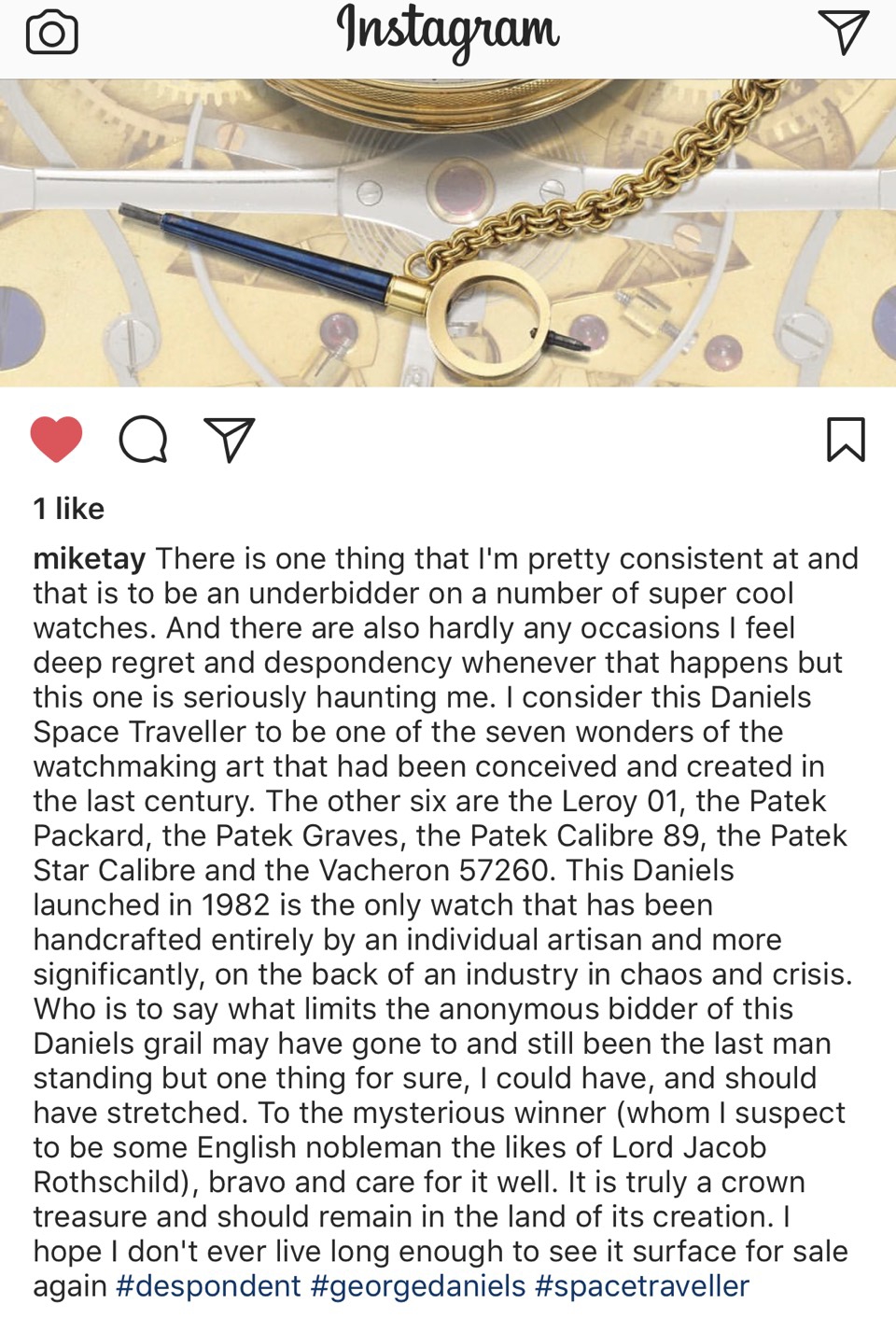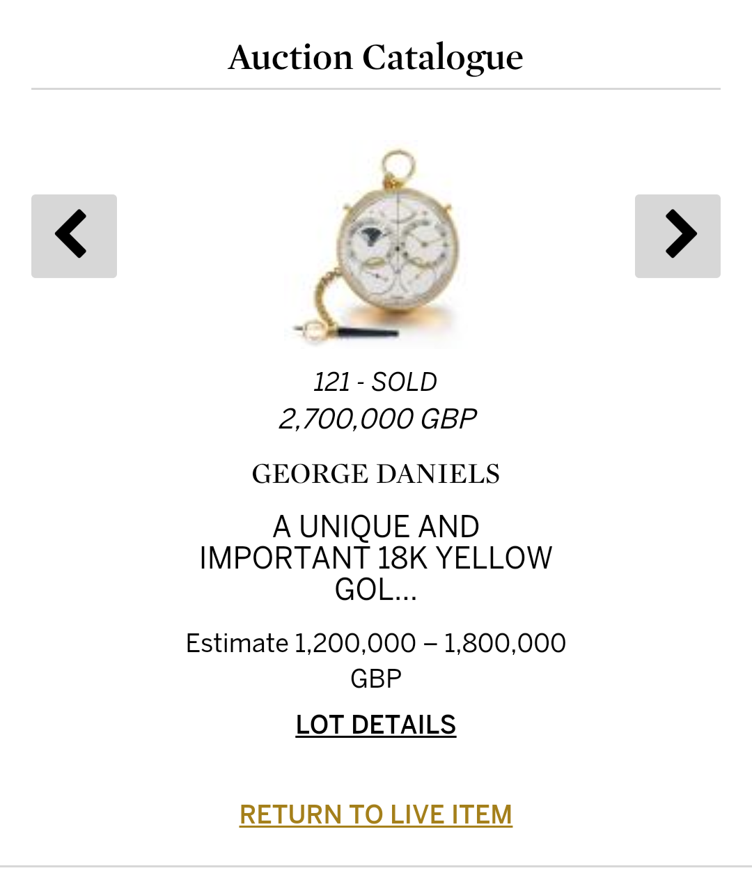 Lot 121 in the Sotheby’s ‘Fine Timepieces including George Daniels Masterpieces) collection, aka the ‘Space Traveller’ achieved a hammer price of 2,700,000 GBP yesterday at auction yesterday, for a grand total of 3,196,250 GBP including the buyer’s premium.