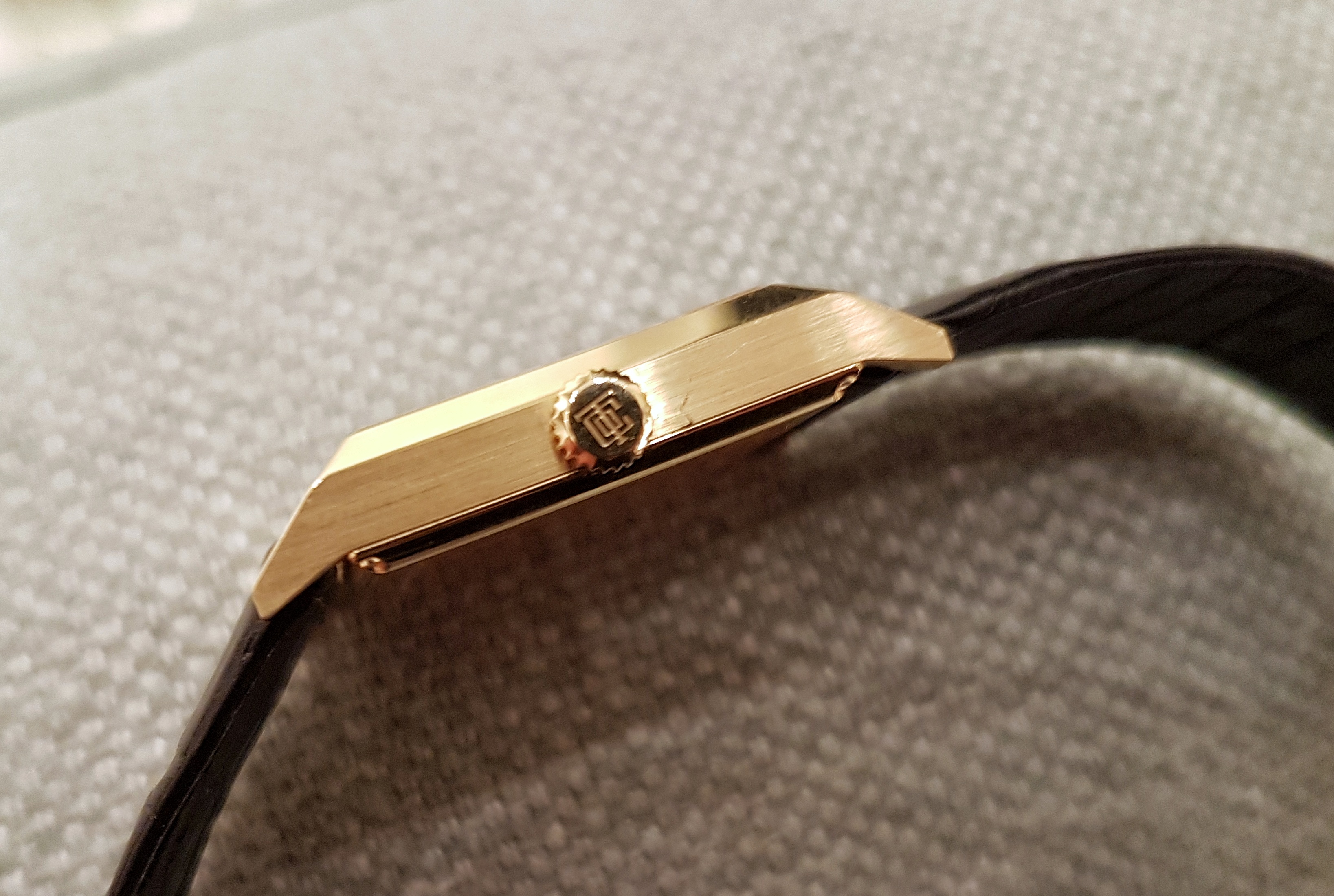 This modern version measures 28mm x 35.8mm, and is a very slim 6.9mm thick. The case is yellow gold, with a combination of polished and satin-brushed surfaces. The polished bezel is angled so that there is an uninterrupted line down to the lugs.