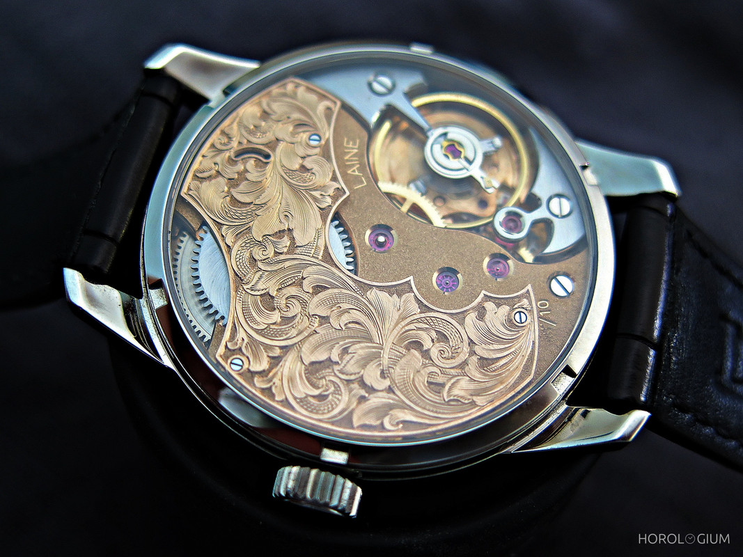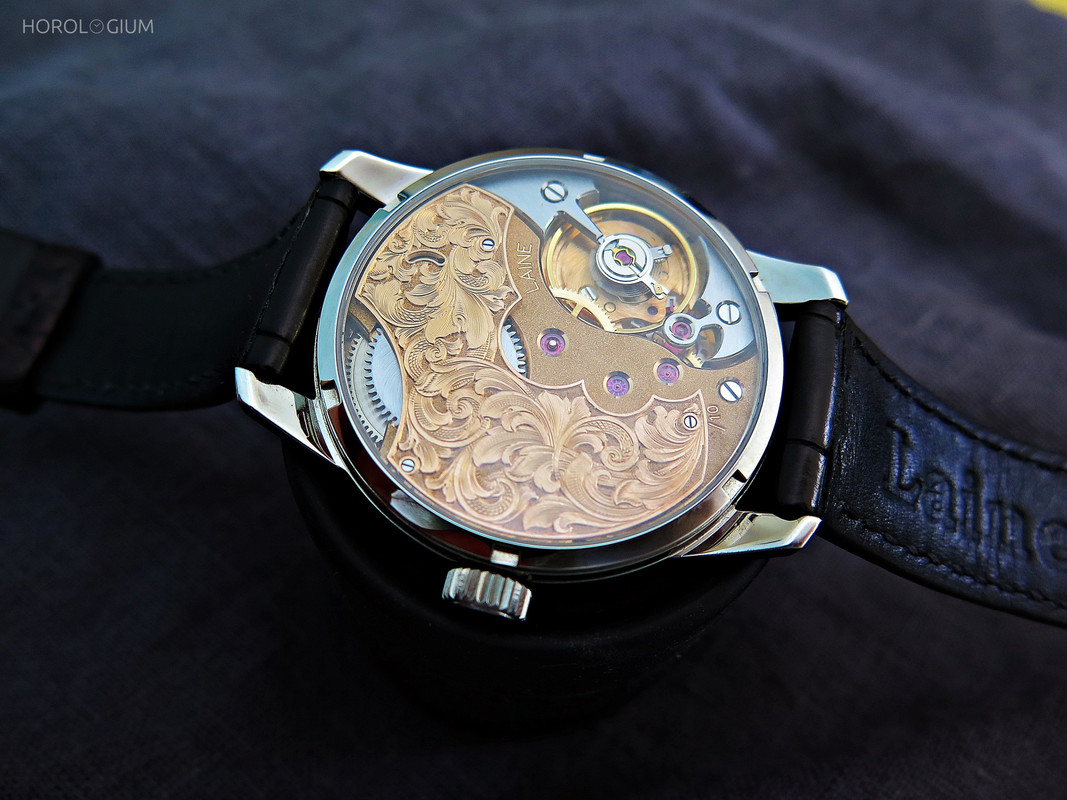 What can you customise? The dials you will see on Laine’s website and in the promotion materials are black, white or blue lacquer, and there several choices for hands, including Breguet and dauphine, but there is also an engraving option.