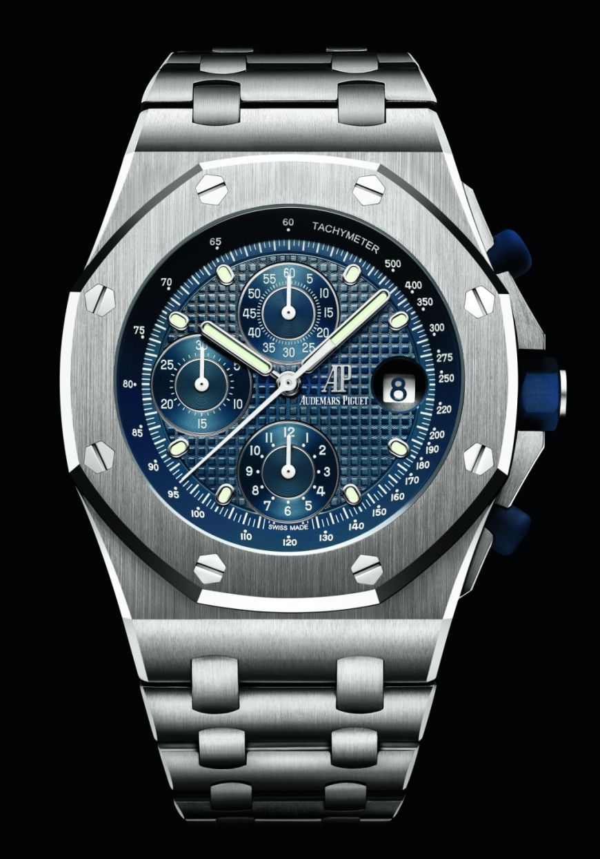 The 42mm stainless steel case has a classic blue ‘Petite Tapisserie’ patterned dial, with blue counters, white gold applied hour-markers and Royal Oak hands with luminescent coating, The dial’s colour is carried through to the blue rubber-clad pushers and screw-down crown. Its case back is engraved with the Royal Oak Offshore logo and ‘Automatic’, and the watch is water resistant to 100 meters